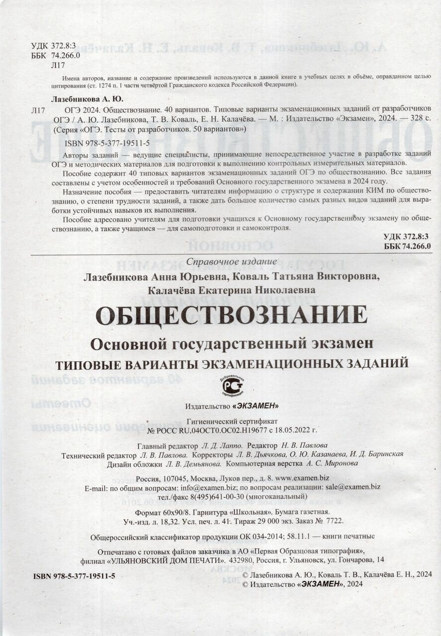 ОГЭ-2024. Обществознание. 40 вариантов. Типовые варианты экзаменационных заданий (Лазебникова Анна Юрьевна, Коваль Татьяна Викторовна, Калачева Екатерина Николаевна); Экзамен, 2023