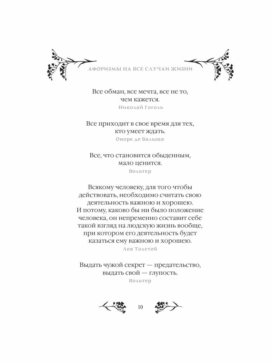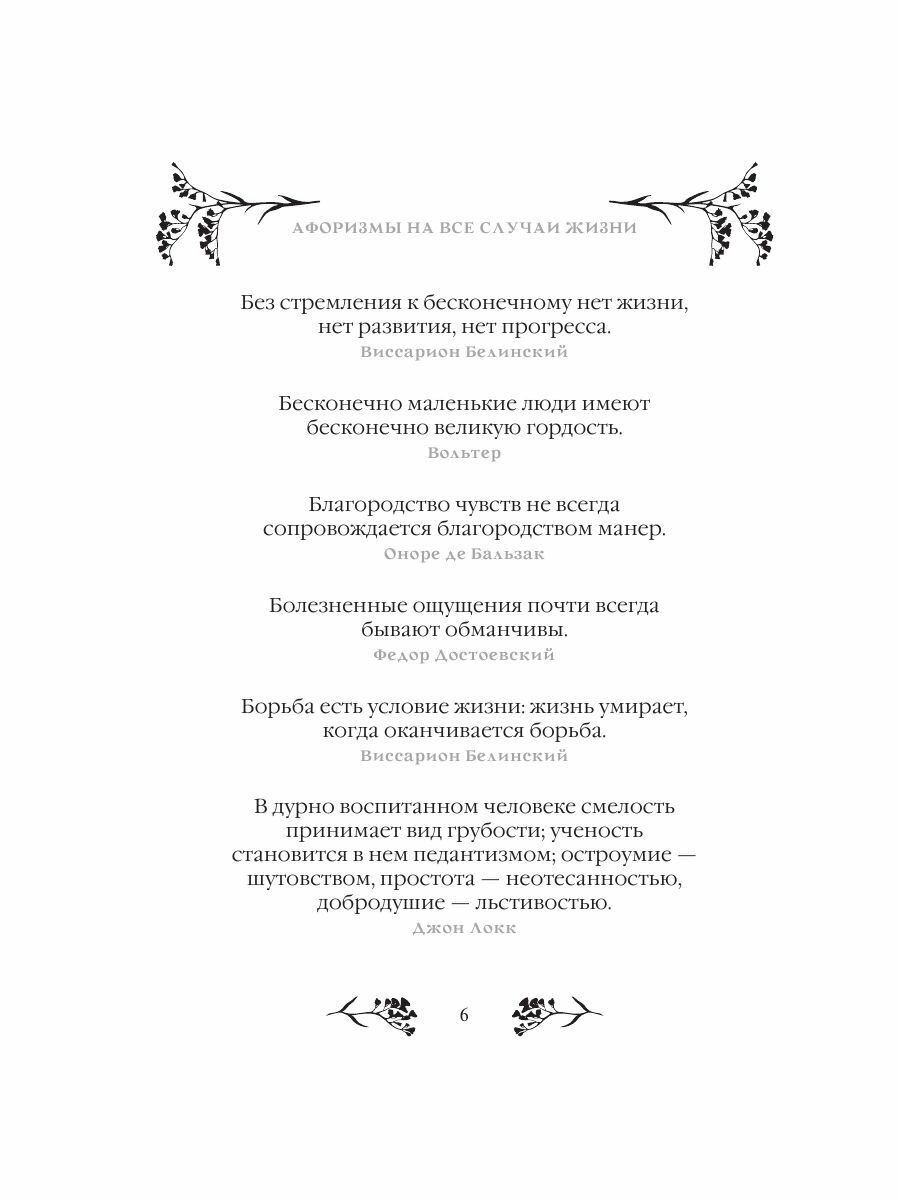 "Афоризмы на все случаи жизни" - это сборник мудрых и проникновенных мыслей, собранных по крупицам со всего мира за тысячи лет. Яркие высказывания философов, государственных деятелей и мастеров слова освещают самые разные аспекты нашей жизни: от любви и дружбы до человеческих слабостей и вопросов денег. Эти темы волнуют каждого из нас. Афоризмы же помогают взглянуть на повседневные ситуации по-новому, служат утешением в трудные времена, побуждают к саморазвитию и дают возможность лучше понять себя, окружающий мир и других людей. Эта книга - ваш незаменимый спутник в непростом, но таком захватывающем путешествии под названием "жизнь".