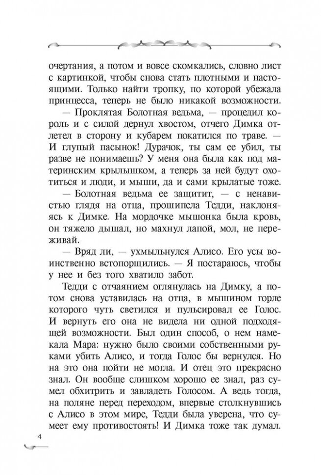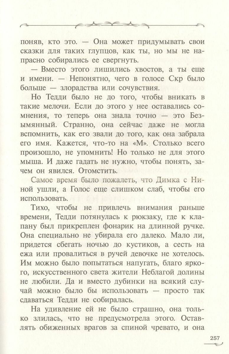 Сводные брат с сестрой, Димка и Тедди, а с ними и птичья принцесса Тинатин не успели покинуть Долину, как в нее пришел отец Тедди, ненаследный мышиный король Алисо. Если верить ему, мать Димки где-то здесь, в долине и ее нужно найти, пока она не погибла. Только можно ли верить Алисо?.. Тедди поверила ему и лишилась своего волшебного Голоса. Теперь ее отец собирает войско против ничего не подозревающего людского мира, намереваясь с помощью мышиной армии и Голоса Тедди завоевать всю страну, а Тедди ничего не может поделать, ведь без Голоса она бессильна! Или все-таки нет? Ведь у нее есть Димка, Тинатин, мышка Нинка и другие, пока не известные ей союзники. И Матильда. Потому что мама обязательно придет, а Голос... Голос один раз нужно потерять, чтобы стать могущественной Королевой, так говорила Мара. Для среднего и старшего школьного возраста.