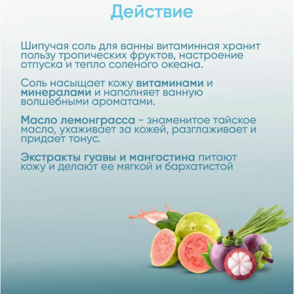 Шипучая соль для ванны витаминная GO TO THAILAND хранит пользу тропических фруктов, настроение отпуска и тепло соленого океана. Закройте глаза, оставьте весь мир позади и перенеситесь на экзотические острова. Соль насыщает кожу витаминами и минералами, и наполняет ванную волшебными ароматами. Масло лемонграсса - знаменитое тайское масло, ухаживает за кожей, разглаживает и придает тонус. Экстракты гуавы и мангостина питают кожу и делают ее мягкой и бархатистой