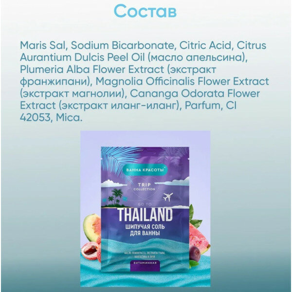| Полное наименование | Соль для ванн Ванна красоты Go to Thailand Витаминная, шипучая |