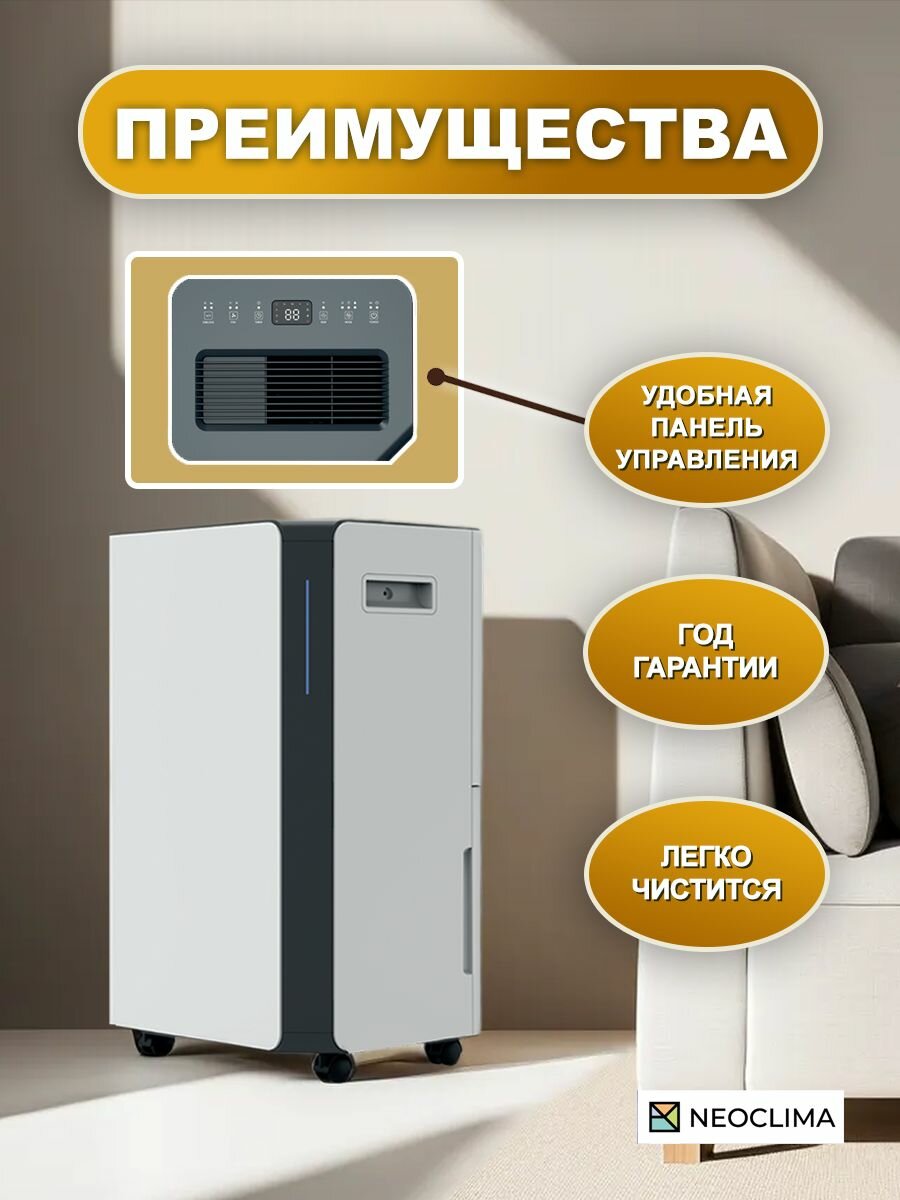 Бытовой осушитель воздуха Neoclima (Неоклима) представляет собой современное устройство для удаления излишней влаги в помещении. Устройство устанавливается на полу, для удобства перемещения предусмотрены колеса. Контролировать уровень влажности удобно благодаря подсветке на передней панели.