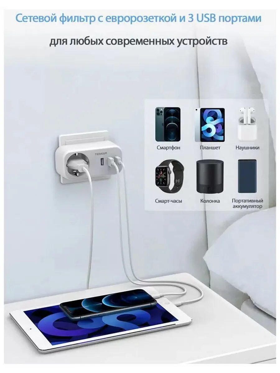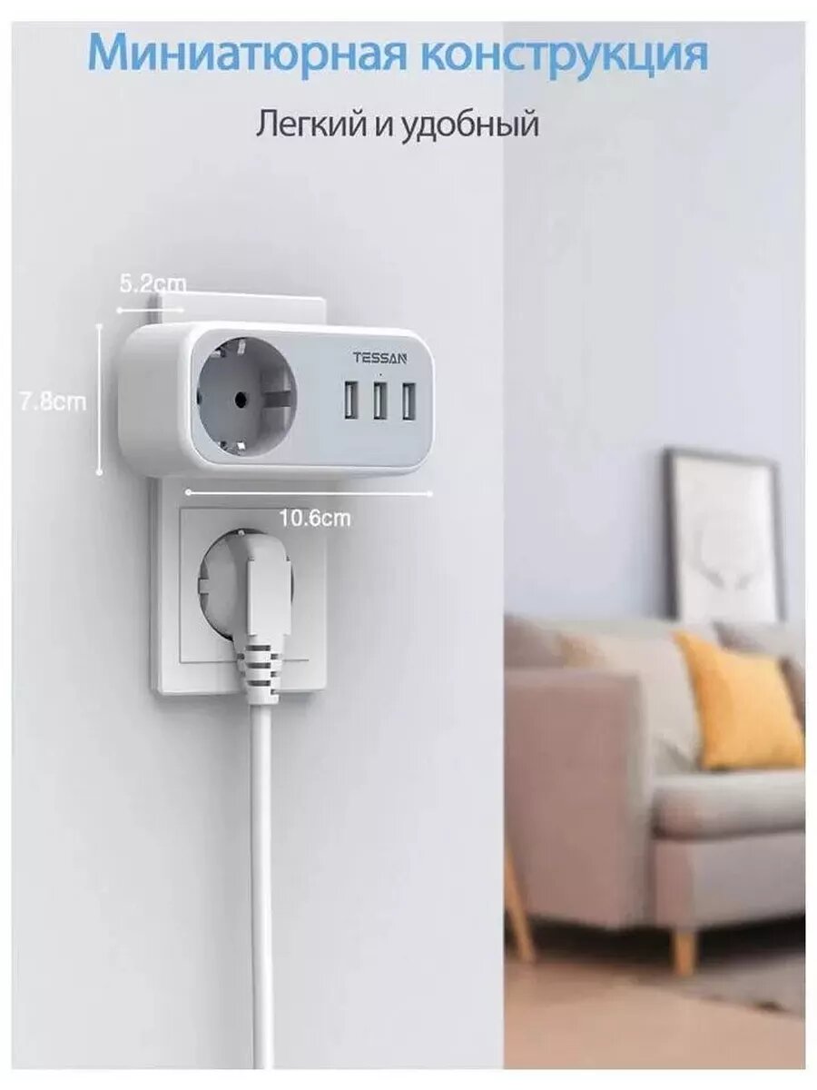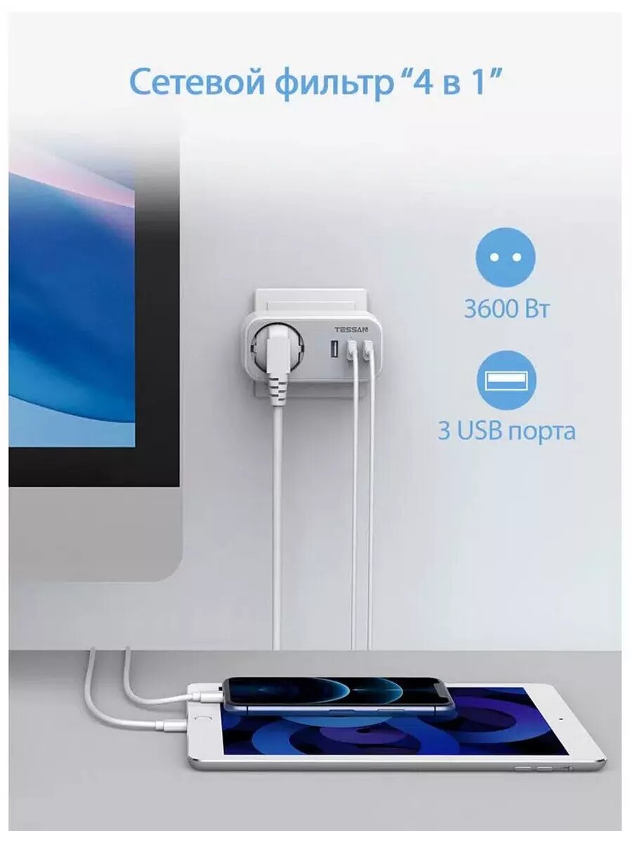 Сетевой фильтр TESSAN 1 розетка 220В и 3 USB порта 3600Вт до 16А (80001845) TS-329 Grey