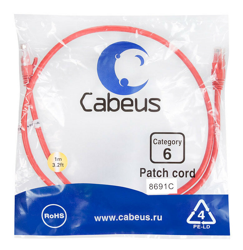 Кабель патч-корд U/UTP 6 кат. 1м Cabeus 2xRJ45/8p8c неэкранированный красный LSZH 1м PC-UTP-RJ45-Cat.6-1m-RD-LSZH