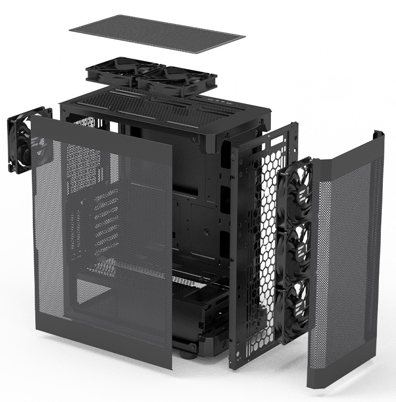 | Расположение вентиляторов | спереди (3 × 120 мм или 3 × 140 мм), сверху (2 × 120 мм или 2 × 140 мм), снизу (1 × 120 мм или 1 × 140 мм), сзади (2 × 120 мм) |