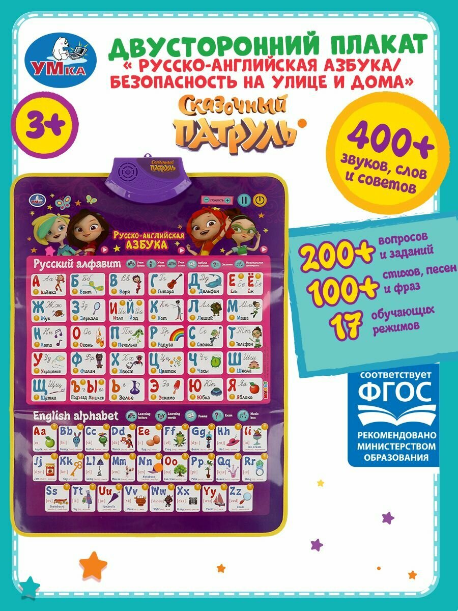 Двусторонний обучающий плакат порадует маленького любознайку красочным дизайном и своим функционалом: 2 рабочие стороны: азбука на 2-х языках и правила безопасности, 70 стихов, 30 забавных звуков, фраз героев и песен из м/ф, 17 обучающих режимов, 200 вопросов и заданий, регулировка громкости. Полезная база для обучения ребёнка в виде обучающего плаката. Преподнесённую в визуальном и звуковом форматах информацию ребёнку будет проще усвоить и запомнить. Малыш с удовольствием будет нажимать на разнообразные кнопки и в лёгкой игровой форме знакомиться с алфавитами русского и английского языков, английскими словами, а также основами безопасности дома и вне его стен. Игровые занятия с обучающим плакатом расширяют кругозор и способствуют развитию: памяти, внимания, визуального и слухового восприятия, речи. Размер: 42 х 59 х 3 см. Размер упаковки: 48 х 22 х 3 см. Работает от 3-х батареек типа ААА (не входят в комплект). Рекомендовано для детей от 3-х лет.