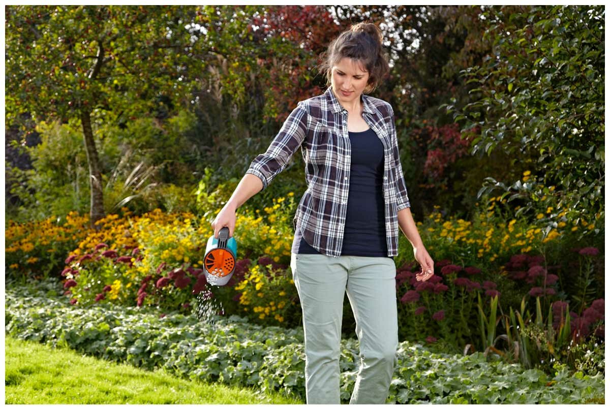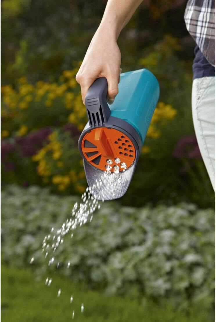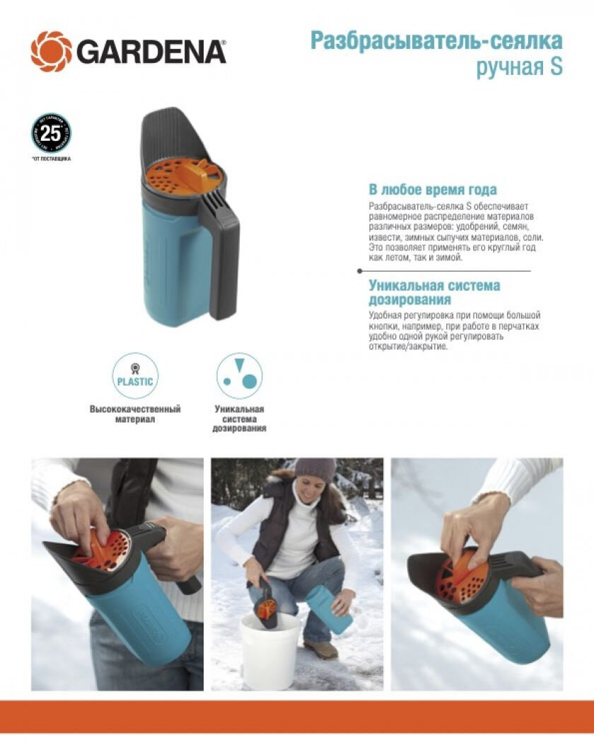 Разбрасыватель-сеялка GARDENA маленькая (03255-30.000.00) служит для распределения семян, удобрений и соли. Модель компактных размеров выполнена из ударопрочного высококачественного пластика. Примерная вместительность: удобрение – 1.65 кг, дорожная соль - 2 кг, семена - 1 кг