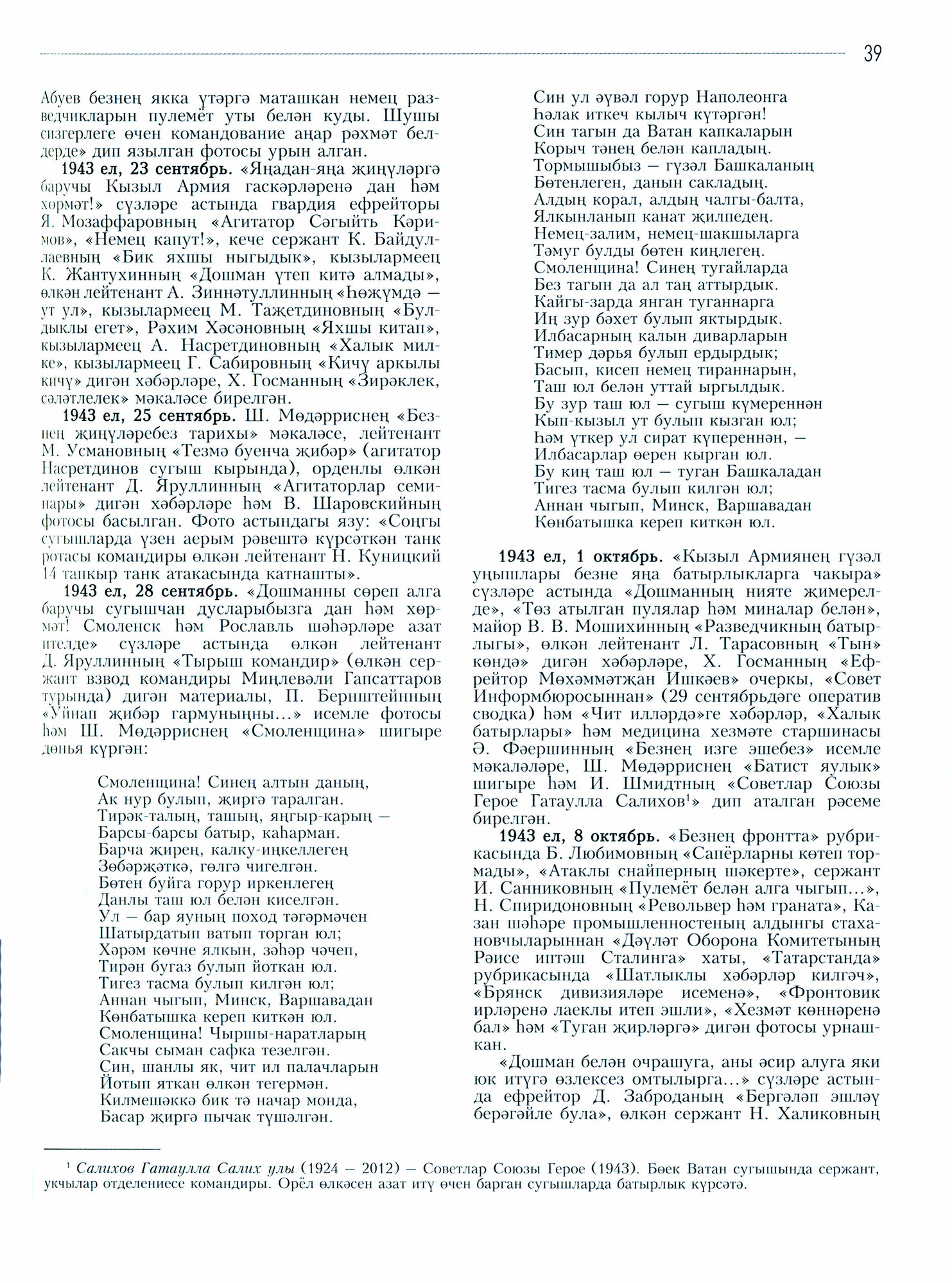 Б?ек Ватан сугышыны? канкойгыч вакыйгаларын, сугышчыларны? батырлыкларын, кичк?н михн?тл?рен фронтта х?рби корреспондентлар яктырткан. «Ут эченд? туган матбугат» китабында татар теленд? чыккан фронт газеталарына к?з?т? ясалды. Татар язучылары ??м журналистларыны? м?кал?л?ренн?н ?зекл?р, шигырьл?р, хатлар да урын алды. ?ыентык фотоматериал бел?н баетылды.