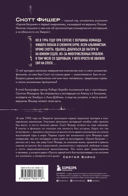 «В мае 1996 года на Эвересте произошла первая серьезная трагедия в коммерческом альпинизме. Участники нескольких экспедиций погибли, либо пропали без вести, а кто-то получил увечья. Скотт Фишер остался на горе навсегда. В книгах и фильмах он показан как личность без истории, будто это так естественно – внезапно оказаться на почти девяти километрах на склоне высочайшей горы в мире. Первые сорок лет жизненного пути Фишера куда интереснее, чем его последние сорок дней на восхождении. «Горное безумие» — рассказ не о том, как умер Скотт Фишер, но описание жизни, прожитой в прямом смысле на высоте, без ограничений, альпинистом с харизмой, любовью к миру и почти сверхчеловеческой выносливостью. Эта книга дает представление о человеке, у которого девиз «Просто сделай это!» был воспроизведен и на логотипе его компании, и начертан в его душе.» — Сергей Бойко