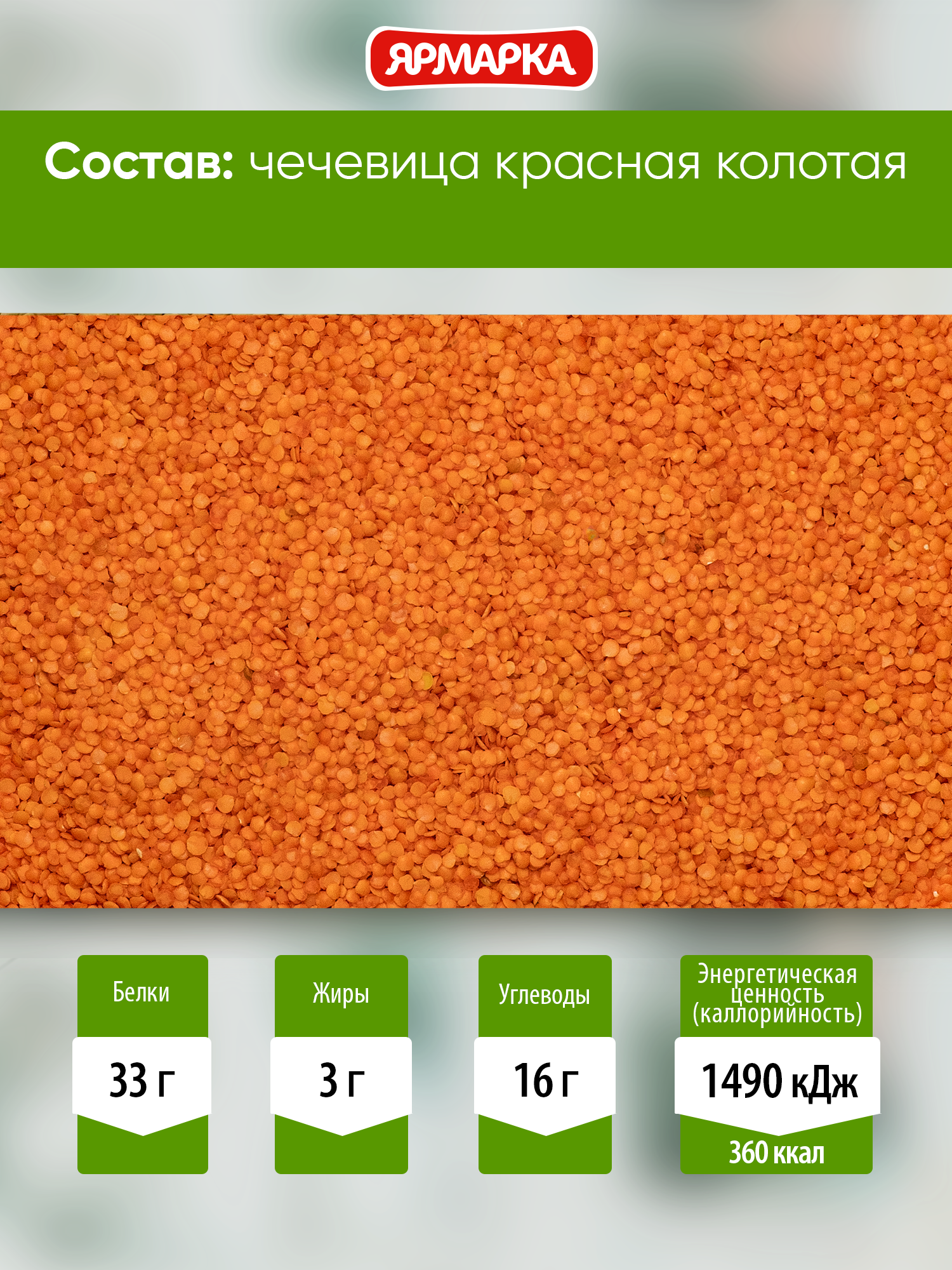 | Состав | Чечевица красная колотая. Может содержать следы глютена, сельдерея, сои, горчицы, арахиса, кунжута, орехов. |