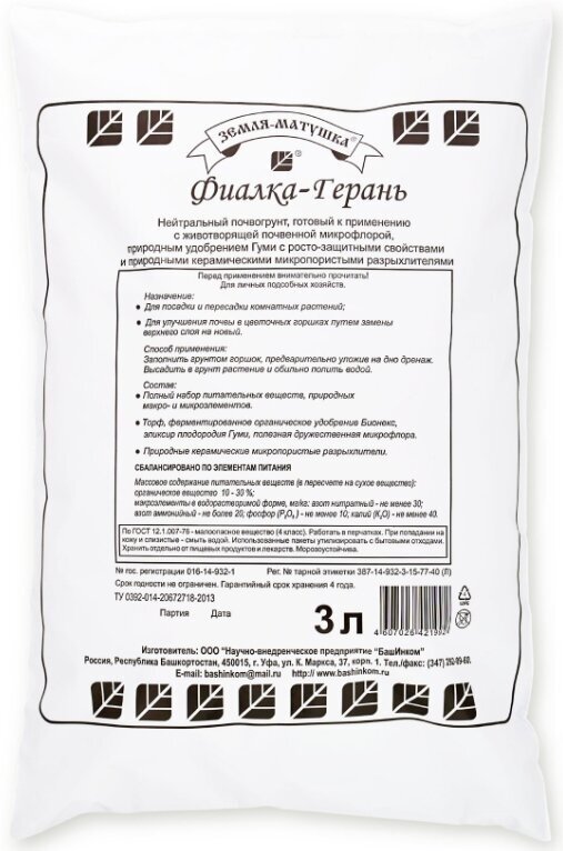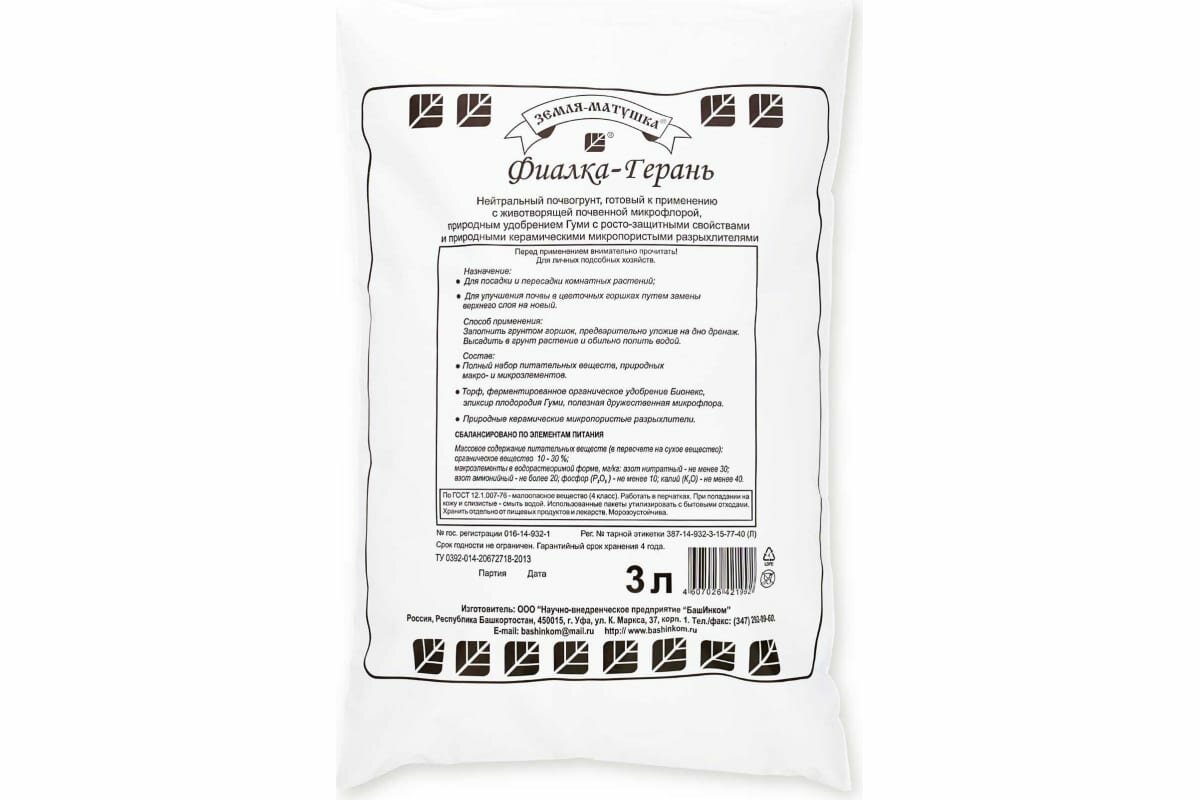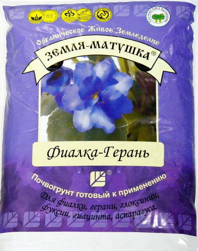 **Почвогрунт Земля-Матушка фиалка-герань 3л** – полностью готовый черноземный почвогрунт, сбалансированный по составу для посадки и пересадки фиалки, герани, глоксинии, фуксии, гиацинта, аспарагуса.