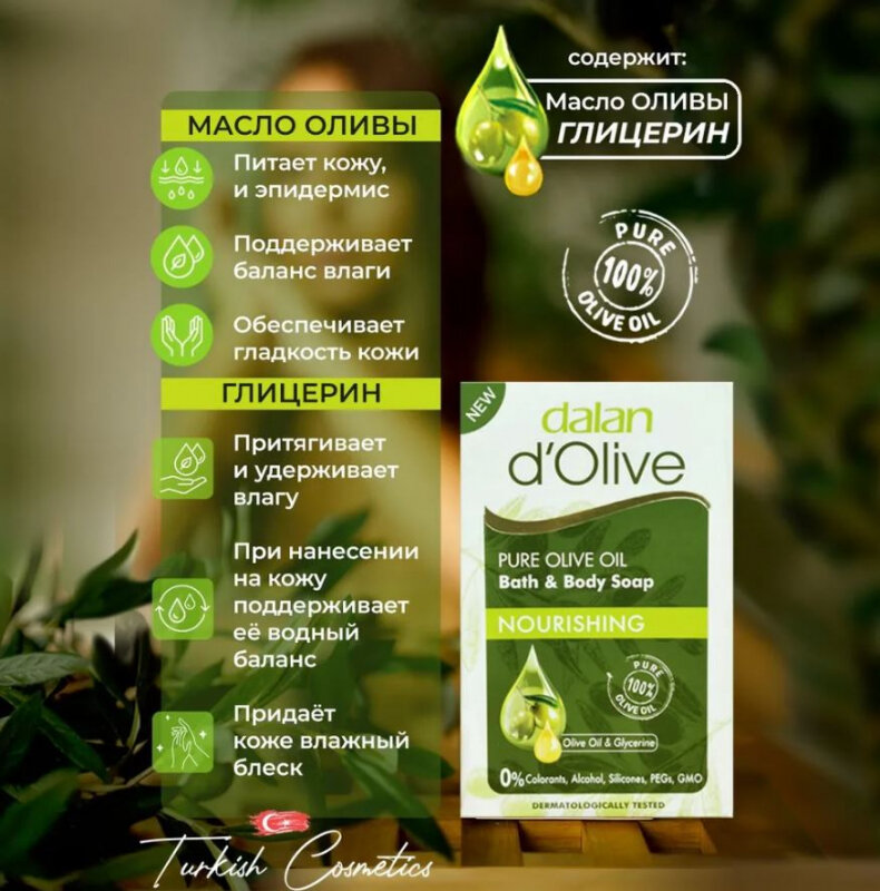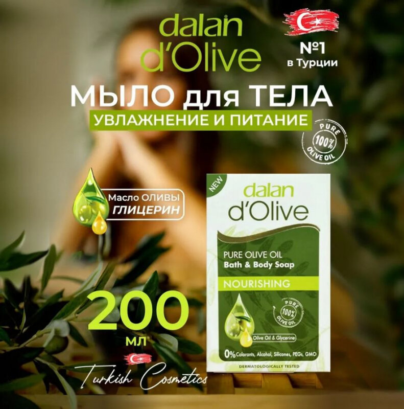 Турецкий популярный бренд DALAN представляет питательное мыло в лучшем традиционном исполнении. Оливковое мыло выполнено только из натуральных компонентов. Крем мыло содержит оливковое масло, плоды собирают с плантаций, расположенных в регионе Эгейского моря. Мыло ручной работы производится полностью людьми, что подчеркивает особую ценность. Подойдет для гигиенических и косметических мероприятий. Можно использовать для всего тела.Мыло турецкое имеет приятный, после применения кожа становится мягкой и шелковистой. Так как олива обладает антисептическим свойством, можно использовать при грибке, ожогах и ранах. Подходит для всех типов кожи и не вызывает аллергической реакции. Мыло для сухой кожи служит увлажняющим средством. Чтобы достичь оптимального эффекта, нужно нанести на кожный покров и вспенить при помощи большого количества воды. Проверена эффективность мыла для волос, не вызывает перхоти и не высушивает кожу головы. Становитесь красивее и здоровее с DALAN.