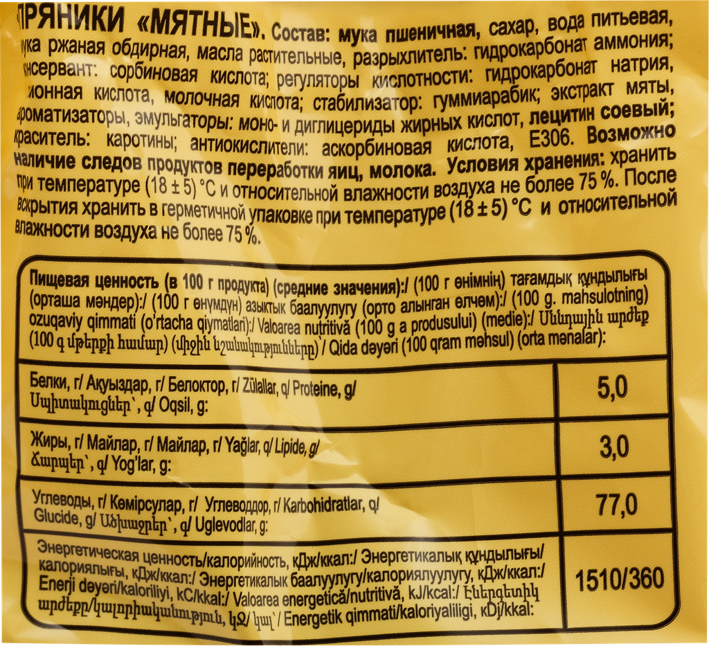 | Состав | Мука пшеничная, сахар, вода питьевая, мука ржаная обдирная, масла растительные, разрыхлитель гидрокарбонат аммония, консервант сорбиновая кислота, регуляторы кислотности (гидрокарбонат натрия, лимонная кислота, молочная кислота), стабилизатор гуммиарабик, экстракт мяты, ароматизаторы, эмульгаторы (моно- и диглицериды жирных кислот, лецитин соевый), краситель (каротины), антиокислители (аскорбиновая кислота, (Е306)). Продукт может содержать следы переработки яиц, молока |