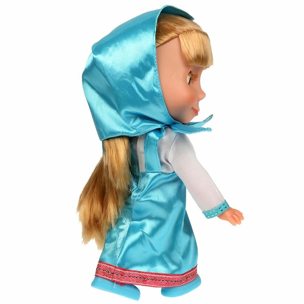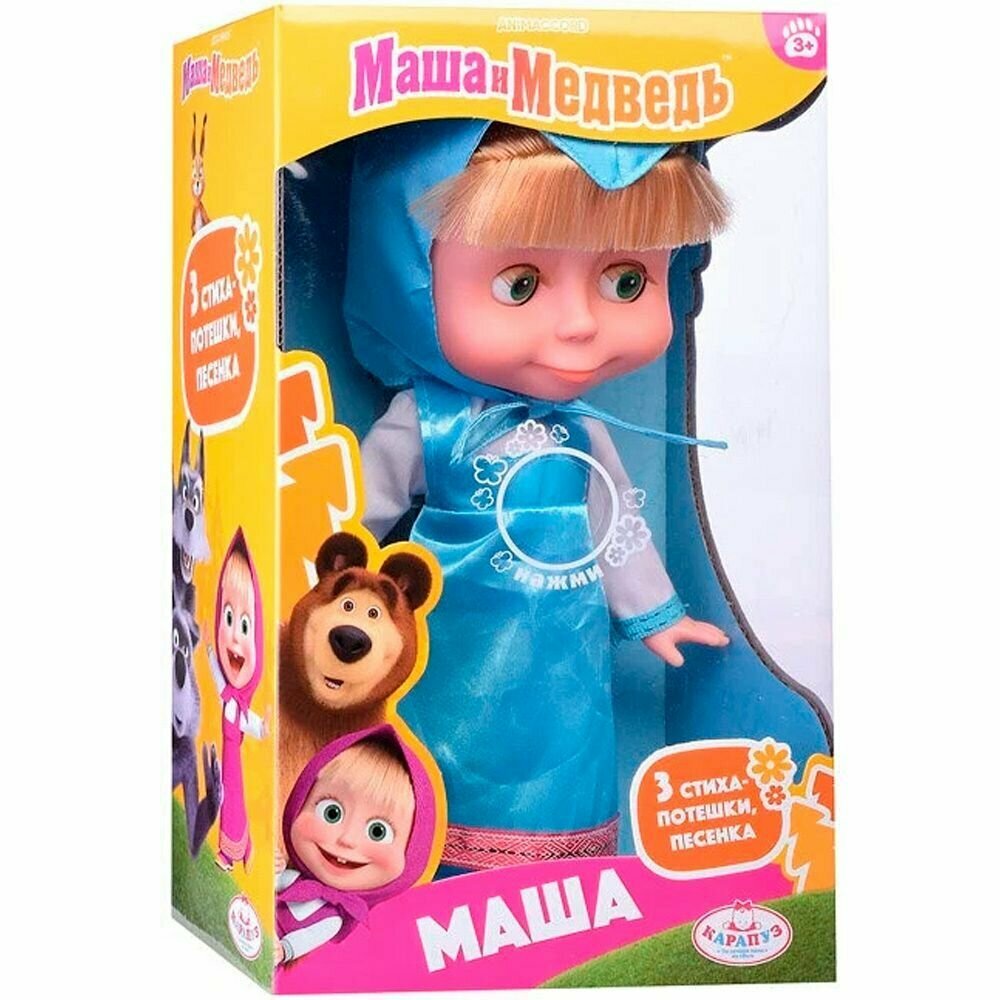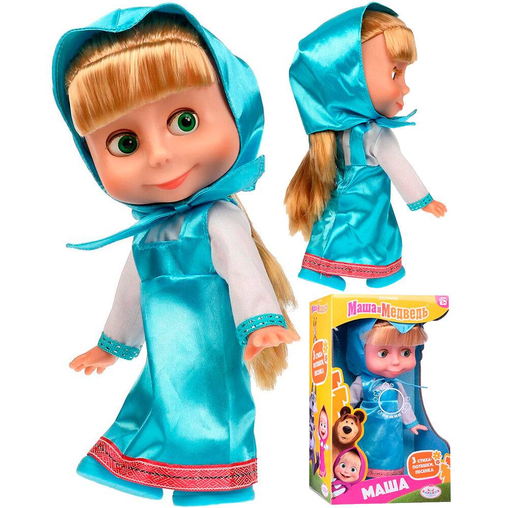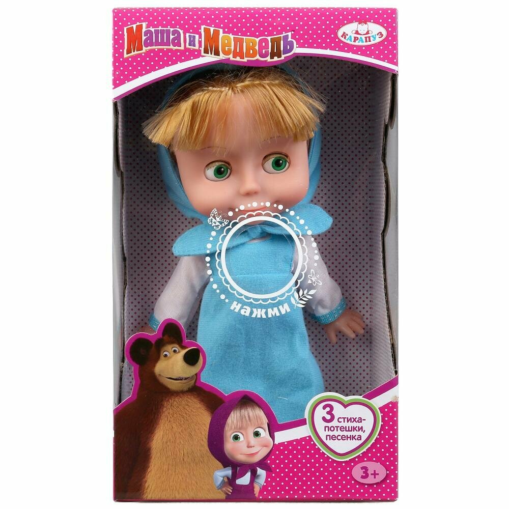 Кукла «Маша», персонаж мультсериала «Маша и Медведь» ТМ «Карапуз» - озвученная игрушка, которая поёт песенку "Про следы" и рассказывает 3 стиха-потешки ("Каша", Каравай", "Мишка косолапый"). Нажмите кнопку на животике. У куколки милые глазки с длинными ресницами, светлые волосы можно расчёсывать.Ручки и ножки куклы подвижны. На Маше голубые сарафанчик и косыночка. Одежду легко снять и надеть. На ногах туфельки.Когда куколка захочет спать, положи её в кроватку. Она закроет глазки и сладко уснёт. Девочка сможет воссоздать сказочные сюжеты и придумать самые разнообразные сценки для своих игр. Сюжетно-ролевые игры - важная часть развития ребёнка. В процессе игры с куклой ТМ «Карапуз» развиваются:- память- звуковое восприятие и музыкальный слух- воображение- социально-коммуникативные навыки Материал: пластмасса+текстиль. Рост куклы 25 см.Работает от 3 батареек LR44 типа (входят в комплект).Рекомендовано детям от 3 лет.