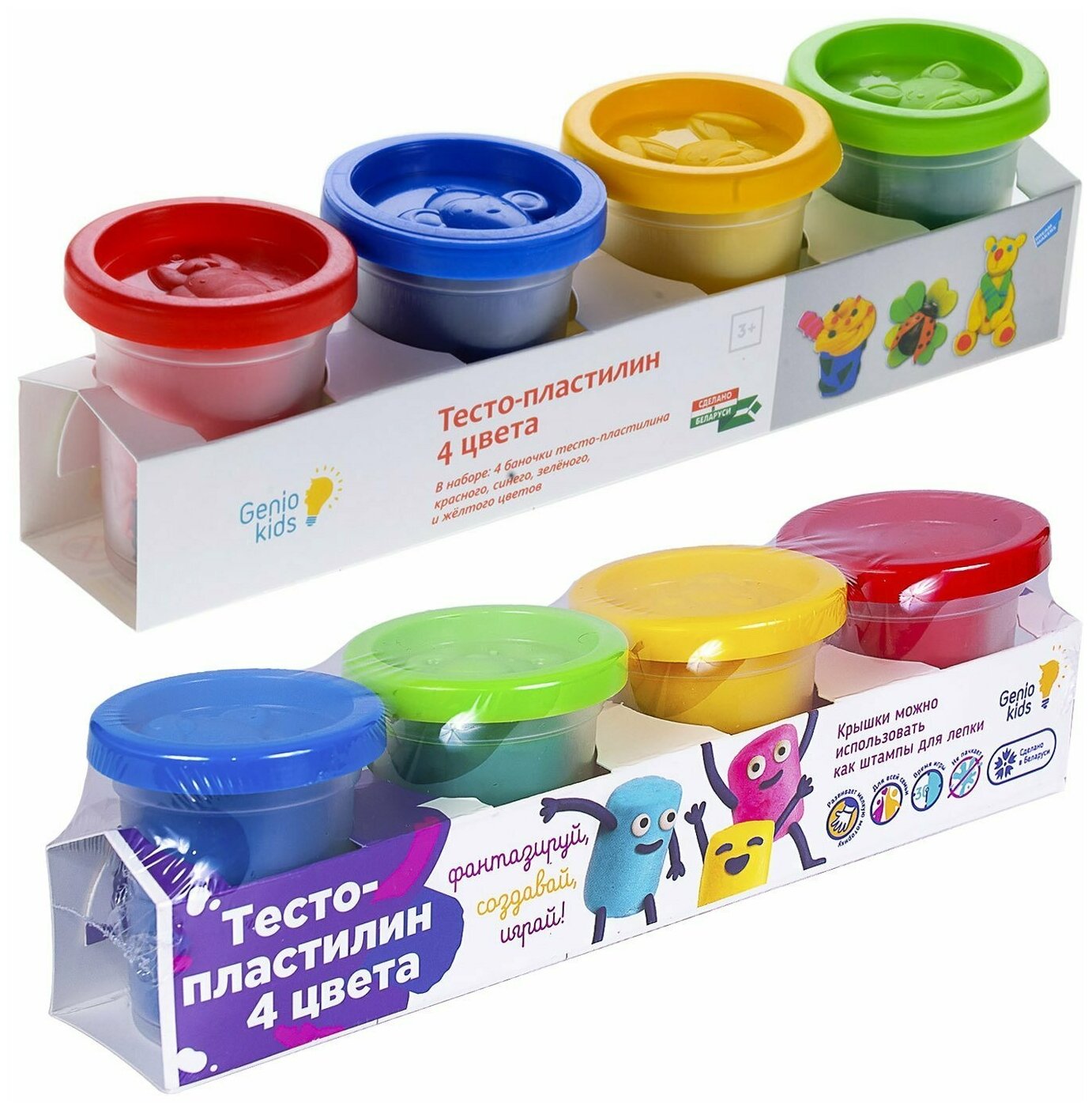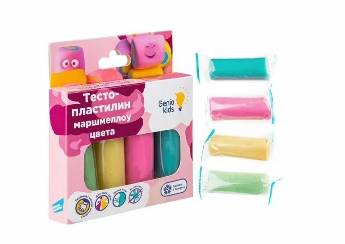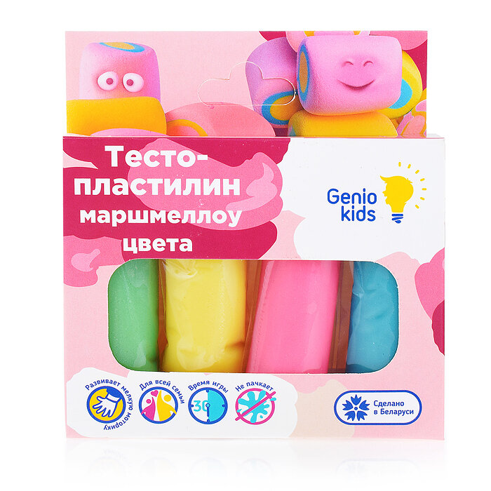 Тесто-пластилин Genio Kids – это отличный способ развития творческих способностей малыша и увлекательное занятие для маленьких непосед. При помощи набора теста ребёнок может создавать фигурки различных форм и видов. Genio Kids вдохновляет на творчество снова и снова Особенности:- брусочки теста находятся в индивидуальной упаковке;- принимает желаемую форму легче, чем пластилин;- застывает на воздухе, сохраняя получившееся изделие на долгое время.Преимущества:1. Изготовлен из высококачественных натуральных компонентов и не вызывает аллергии.2. Пластичный и приятный на ощупь, обладает приятным ароматом.3. Не пачкает руки и не оставляет следов на мебели, стенах и одежде.4. Фигурки из теста-пластилина хорошо застывают.5. Способствует развитию творческих способностей и воображения у детей, развивает мелкую моторику, знакомит с формами и цветами.6. Сделано в Беларуси.Возрастная адресованность: от 3 лет.Размер упаковки: 11х2х12 см.Упаковка: картон. В наборе: 4 пакетика тесто-пластилина по 30 гр. в индивидуальной упаковке.Состав теста: мука, вода, крахмал, соль, ароматизатор, краситель. Цвета на выбор: жёлтый, розовый, голубой, салатовый