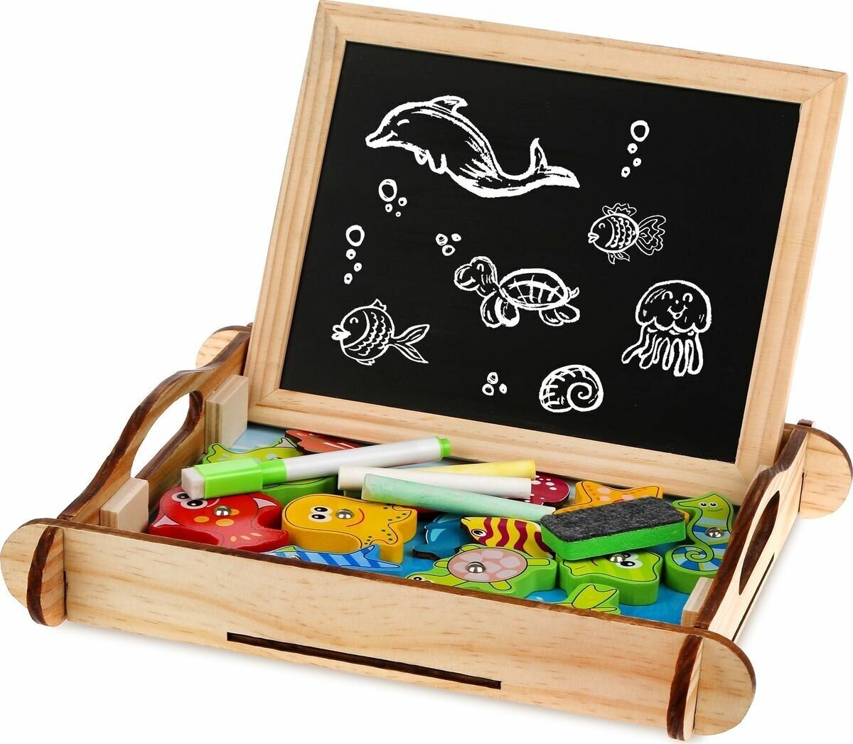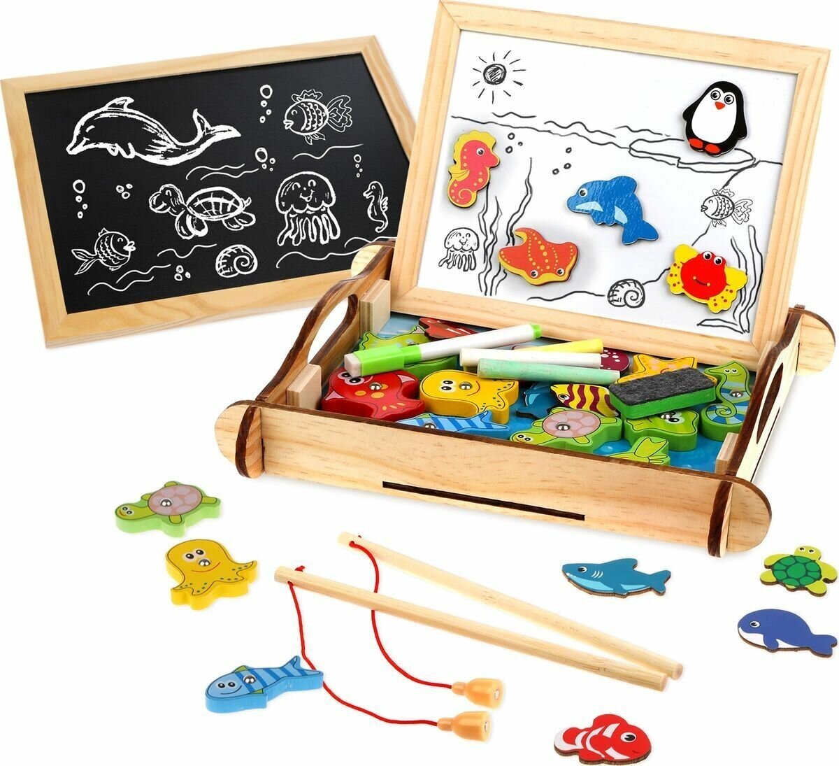 | Комплектация | доска для рисования, ящик, мелки, фломастер, инструкция, губка, магниты 14 шт, фигурки 12 шт, удочки 2 шт. |