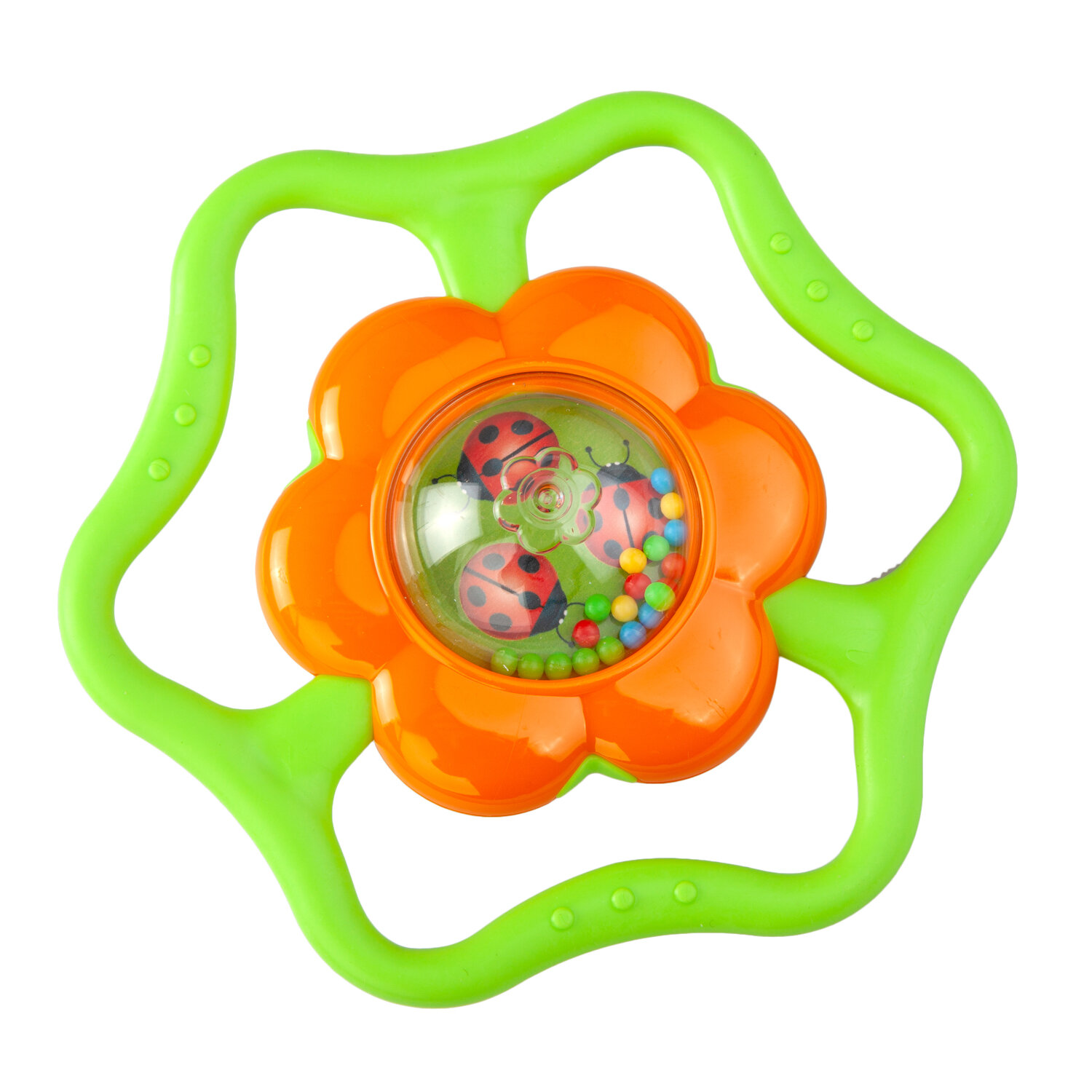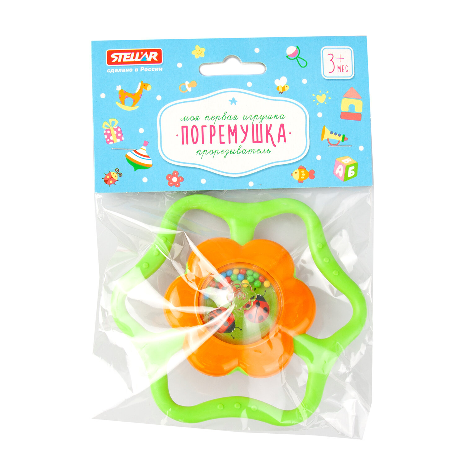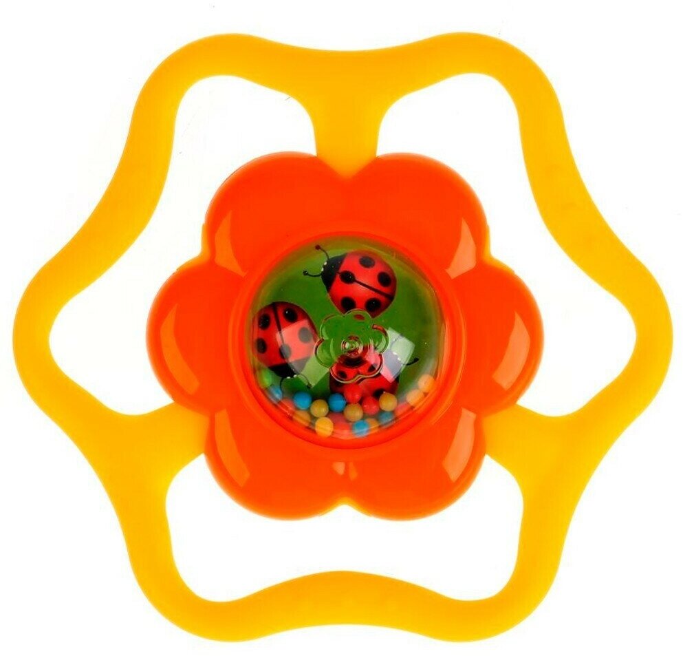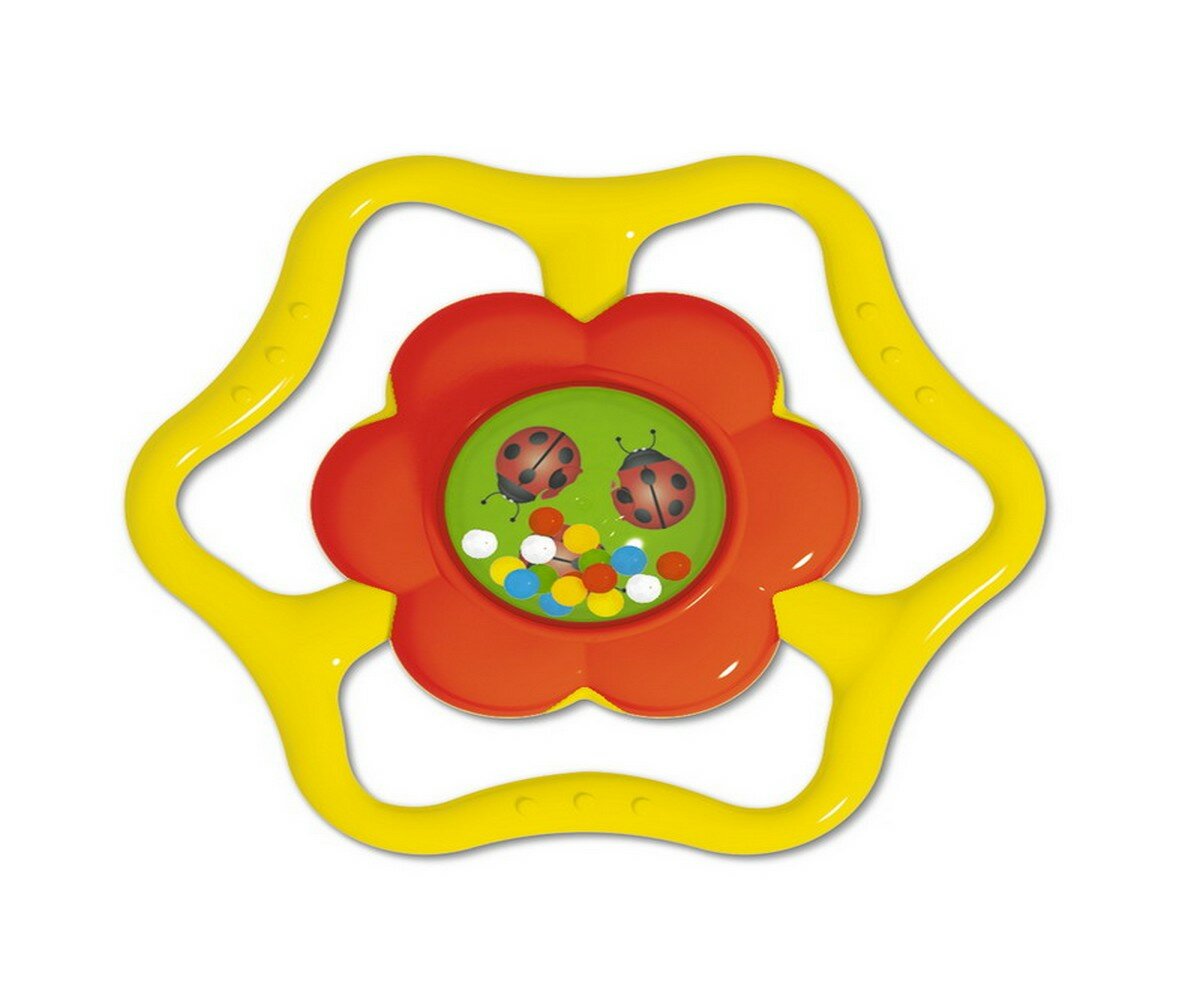 Погремушка выполнена в форме яркого цветочка, окруженного мягкими лучами солнышка. С одной стороны цветочка находятся разноцветные шарики и яркая картинка, а с другой - шарики и зеркальце. При движении шарики пересыпаются и издают «струящийся» звук. Ребенку будет очень удобно держать погремушку, так как её форма разработана специально для маленьких ручек. Погремушка-прорезыватель выполнена из высококачественных материалов и абсолютно безопасна для детей.