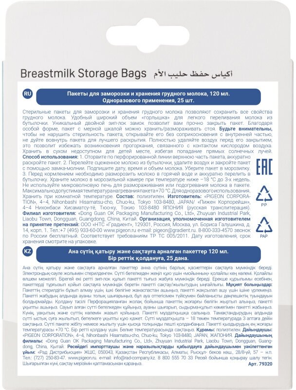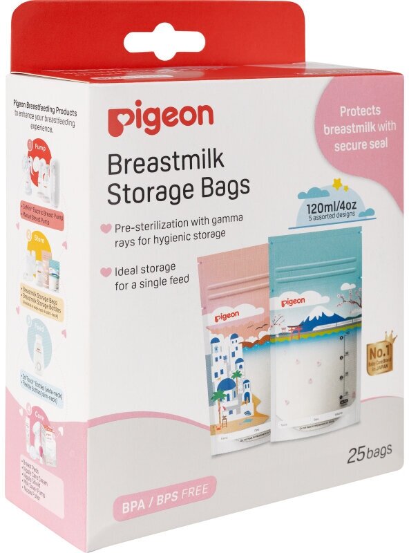 Пакеты Pigeon д/заморозки и хранения грудного молока 120 мл, одноразового применения, 25 шт, дизайн Holiday.Безопасное и простое решение для хранения сцеженного молока. Позволяют надежно сохранить все полезные вещества грудного молока. Благодаря особой конструкции пакета позволяют полностью удалить воздух из пакета, таким образом, что риск прогоркания, связанный с кислородом воздуха исключается.Простерилизованы ионизирующим способом.Двойной зип-лок замок позволит вам надежно и герметично закрыть пакет.Устойчивая конструкция дна пакета.Удобный широкий объем «горлышка» для легкого переливания молока.Специальное место для фиксации даты и объема наполнения пакета сцеженным молоком.Удобная мерная шкала.Не содержит пластификаторов, бисфенол-А.Изготовлены из полиэтилена низкой плотности (полиэтилен высокого давления) – отличающегося особой прочностью, легко выдерживает воздействие низких температур. Является экологически безопасным материалом, как для человека, так и для окружающей среды, так как он не выделяет никаких токсичных веществ и абсолютно безопасно может использоваться для контакта с продуктами питания и изготовления детских товаров. Пакеты одноразовые, стерильно упакованы, подходят ко всем маркам молокоотсосов, рекомендуются и для кратковременного и для длительно хранения любых объёмов грудного молока.