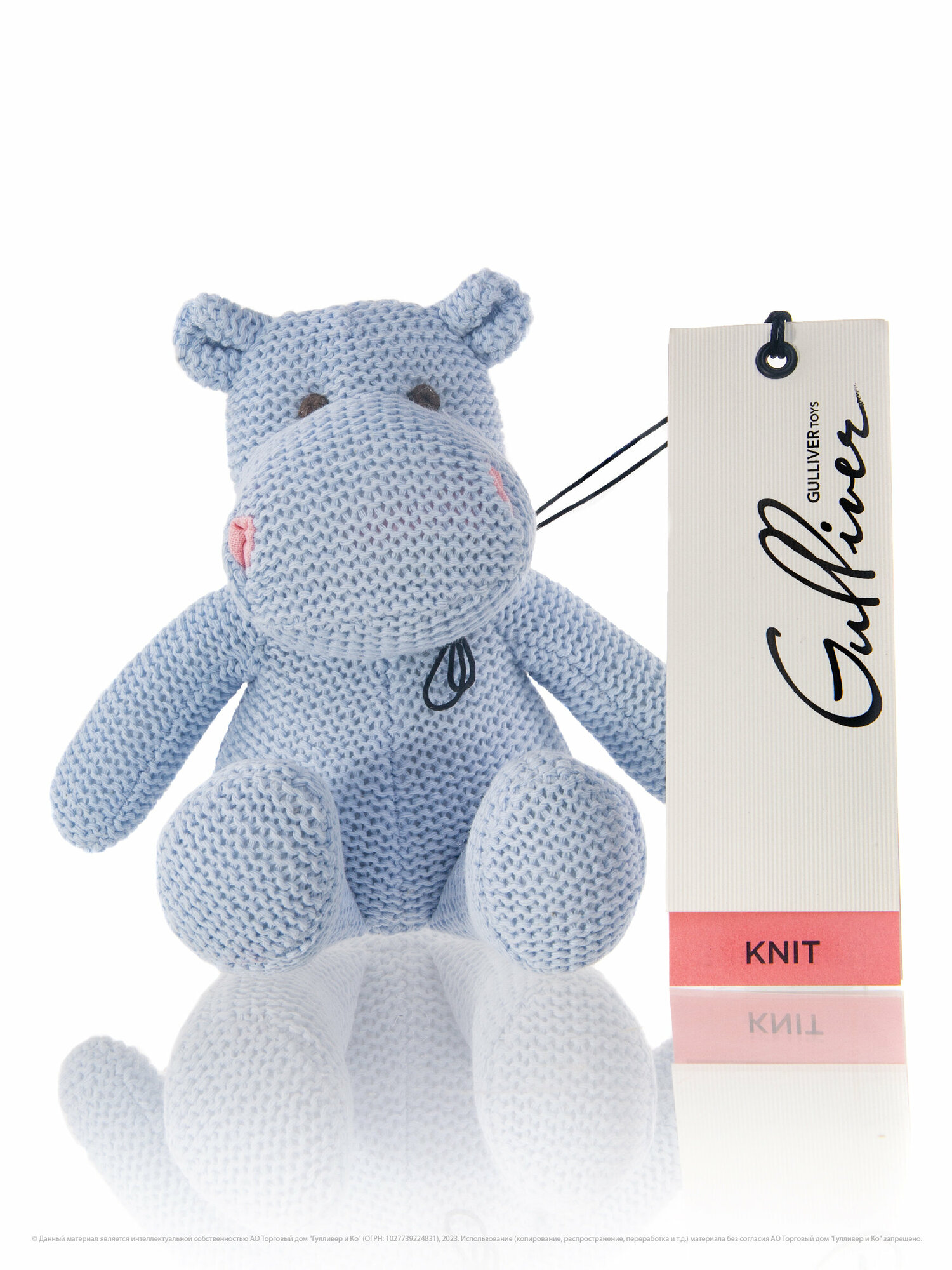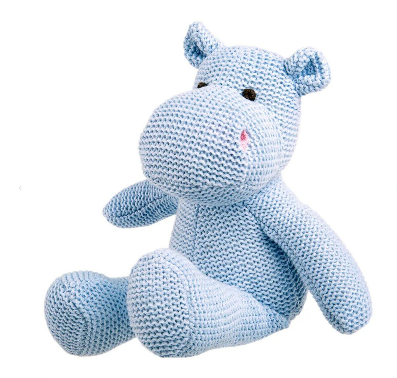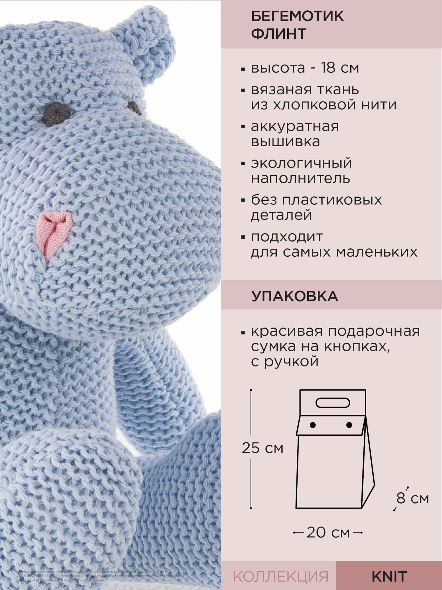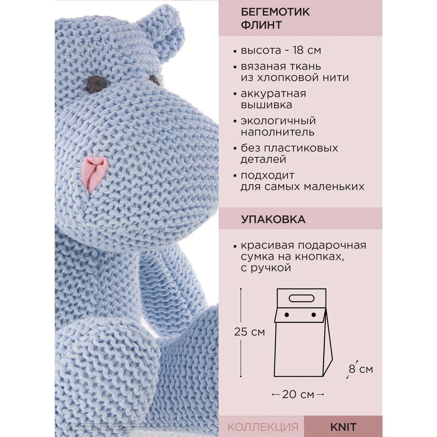 Маленький, аккуратный вязаный бегемотик Флинт из коллекции "Knit" такой милый, что трудно пройти мимо него. Бегемотик связан из качественной хлопковой нити и очень приятен на ощупь. Он красивого голубого цвета c вышитыми серыми глазками, а также забавными розовыми ноздрями. Такая мягкая игрушка может быть интерьерной, она привнесет уют и в детскую комнату и в гостиную, бегемота можно посадить на полку или комод и он не займет много места. Флинт очень понравится малышам, он маленький, компактный и безопасный, его можно взять на прогулку и он подойдет даже для самых маленьких. Игрушка упакована в плотную прозрачную подарочную сумочку с логотипом. Высота игрушки в полный рост - 18 см. Игрушку можно стирать в щадящем режиме при температуре не более 30' и низких оборотах. Игрушка изготовлена из безопасных гипоаллергенных материалов. Товар сертифицирован.