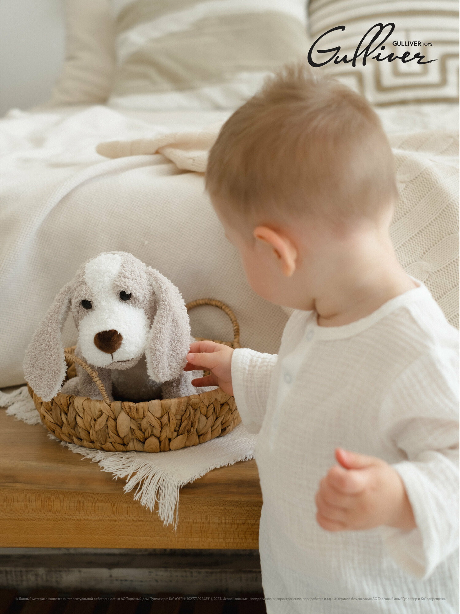 У плюшевой собачки из лимитированной коллекции мягких игрушек Gulliver "Selection" преданный и наивный взгляд, практически как у настоящего щенка. У нее длинные уши, слегка вытянутая мордочка, плюшевый нос и красивые глазки пуговки. Она приятная на ощупь и напоминает нежное махровое полотенце. Мягкая игрушка собачка придется по душе и взрослым и детям. Собака мягкая игрушка представлена в сидячем положении, благодаря чему прекрасно впишется в полочное пространство, на кровати или диване, тумбочке или комоде в любой комнате, будь то спальня, гостиная или детская комната. Мягкие стильные игрушки гулливер коллекции Selection - отличный подарок на День Рождения, Новый год и Рождество, крестины, именины, 8 марта, 14 февраля, день защиты детей и другие праздники. Плюшевый щенок упакован в плотную прозрачную брендированную сумочку на кнопках, которая также является и подарочной упаковкой. Высота игрушки - 22 см. Игрушку можно стирать в щадящем режиме при температуре не более 30' и низких оборотах. Игрушка изготовлена из безопасных гипоаллергенных материалов. Товар сертифицирован. В коллекции Selection вы также можете найти другие интересные игрушки - плюшевый зайка, мягкая игрушка жираф, плюшевый мишка, мягкая игрушка щенок, лисичка мягкая игрушка и другие качественные игрушки.
