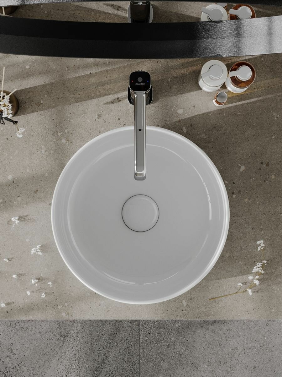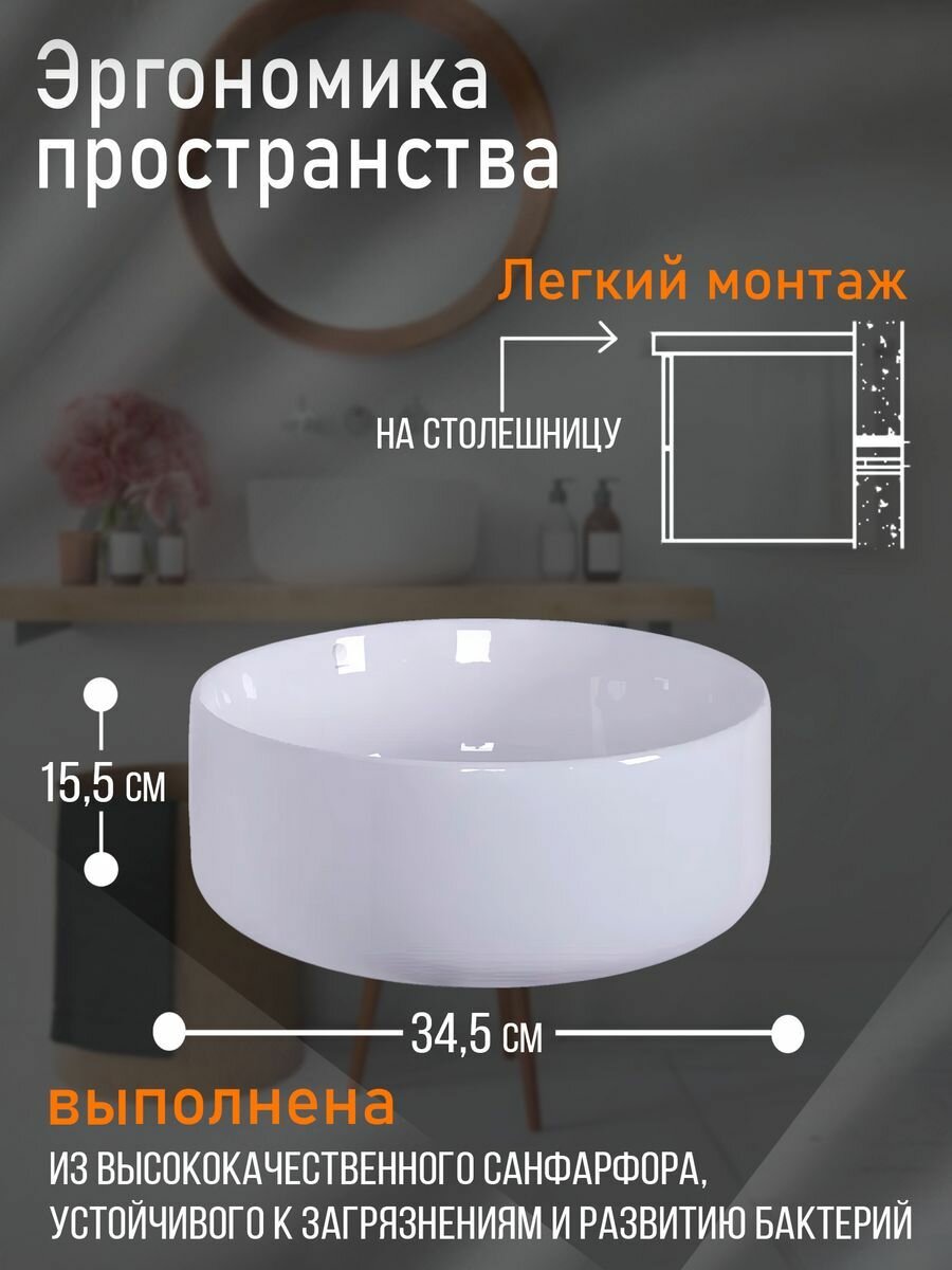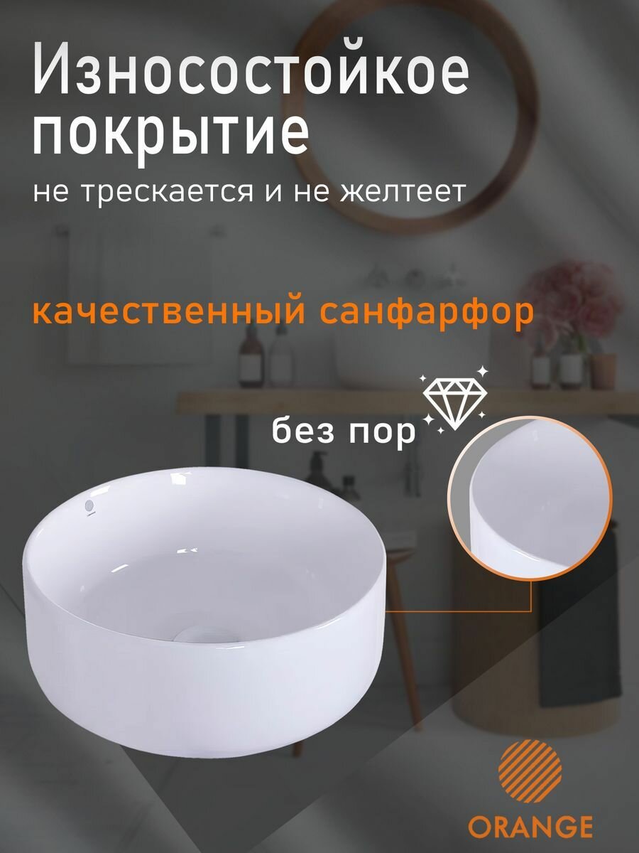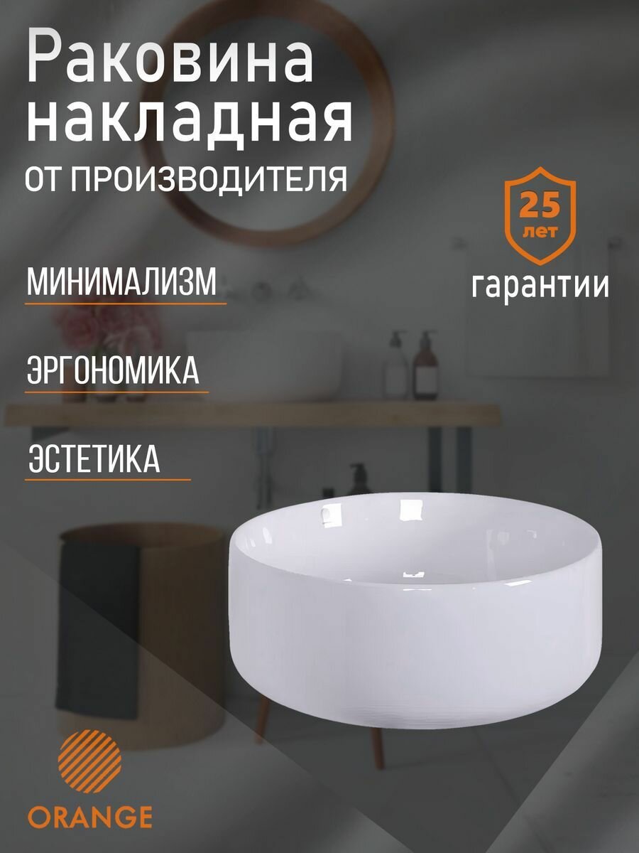 Накладная раковина выполнена в минималистичном дизайне из высококачественного фарфора, который имеет плотную и гладкую поверхность, отсутствие пористости - гарантия сохранения красивой поверхности, устойчивой к различного рода загрязнениям. Устанавливается на столешницу, монтаж не требует специальных навыков. Без отверстия под смеситель, без перелива. Донный клапан приобретается отдельно!