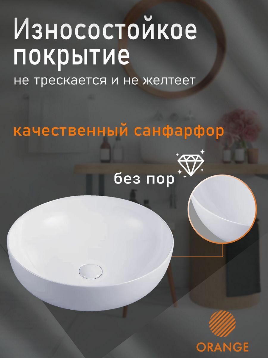 Накладная раковина выполнена в минималистичном дизайне из высококачественного фарфора, который имеет плотную и гладкую поверхность, отсутствие пористости - гарантия сохранения красивой поверхности, устойчивой к различного рода загрязнениям. Устанавливается на столешницу, монтаж не требует специальных навыков. Без отверстия под смеситель, без перелива. Донный клапан приобретается отдельно!