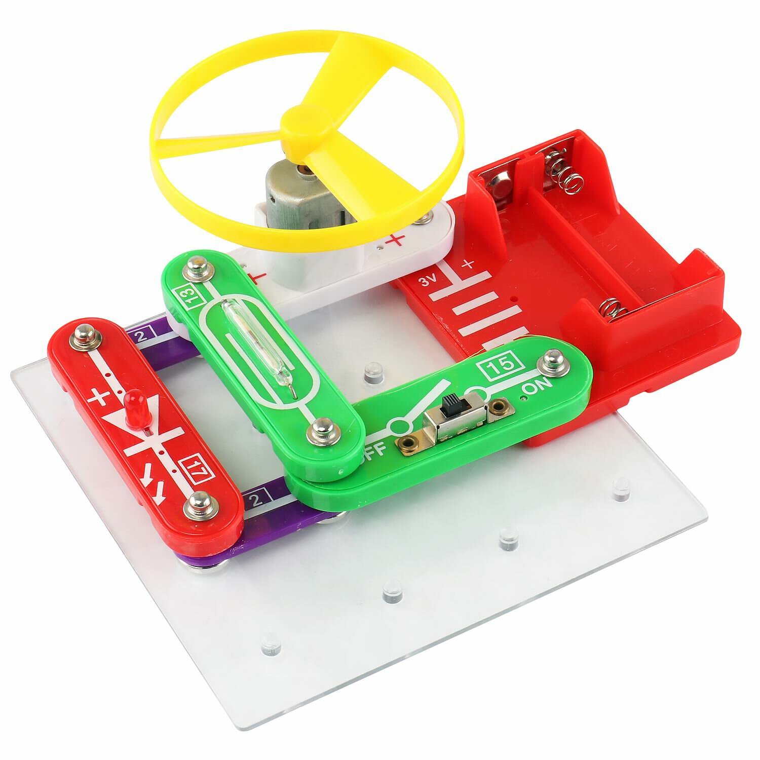 В наборе красочное руководство, в котором подробно описаны и изображены поэтапные шаги сборки электрических цепей. Данный набор знакомит детей, на практике, с основами физики и устройством электронных приборов.