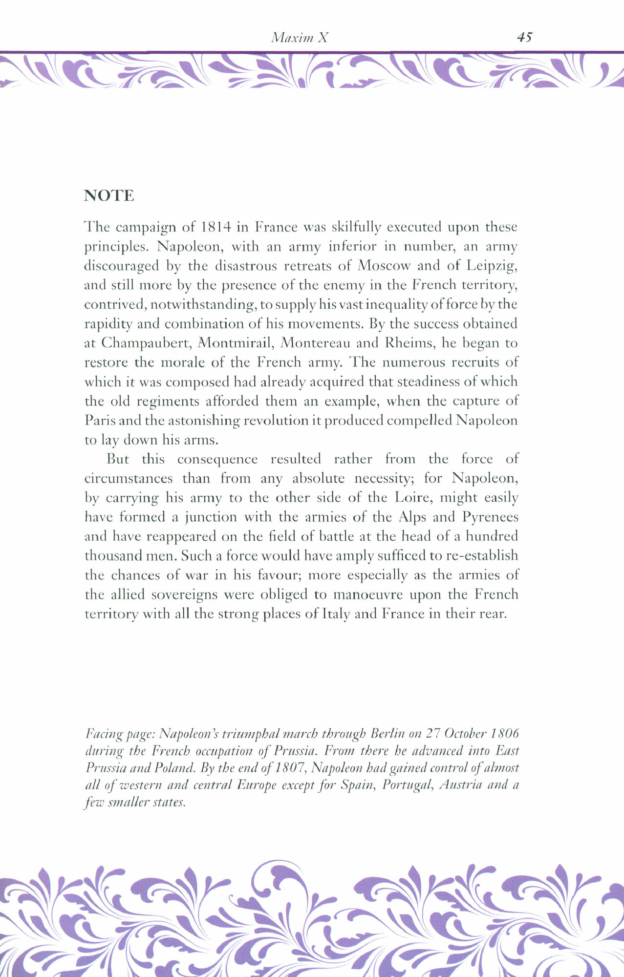 This beautifully illustrated, silk-bound edition of Napoleon's maxims for conduct on the battlefield gives a fascinating insight into his knowledge, intuition, and resourcefulness. His ideas have shaped the opinion of generations of military strategists, politicians, and business entrepreneurs, and are still relevant today. The translation, by British army officer Colonel George D Aguilar, contains notes exploring the background to Napoleon s theories of war and the leaders who inspired him.