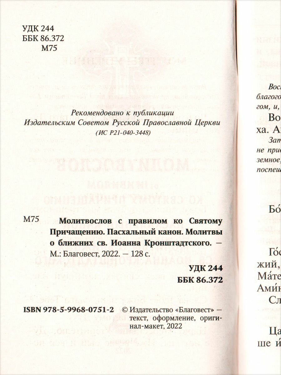Молитвослов с правилом ко Святому Причащению. Пасхальный канон. Молитвы о ближних св. Иоанна Кронштадтского (Плюснин Андрей И. (редактор)); Благовест, 2024