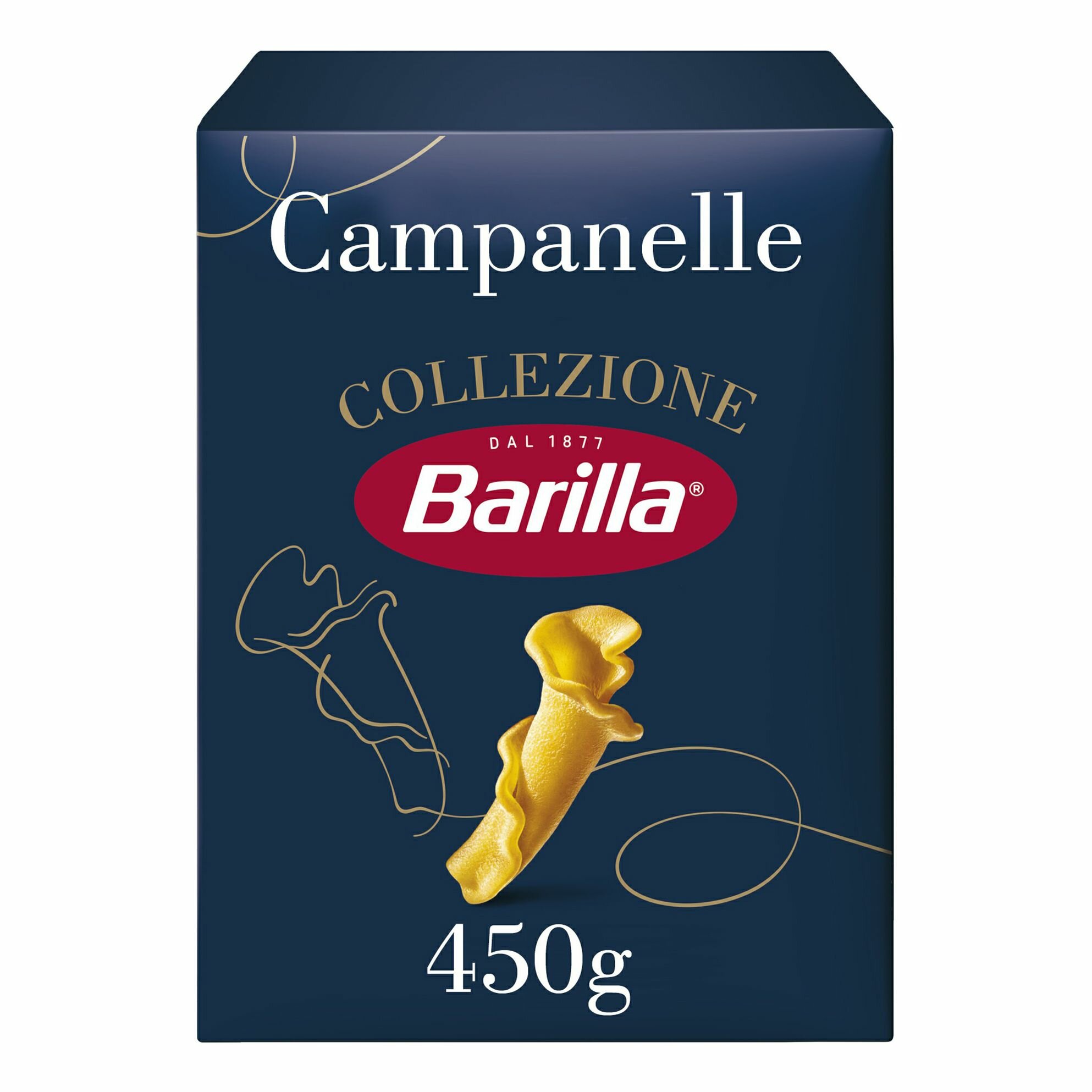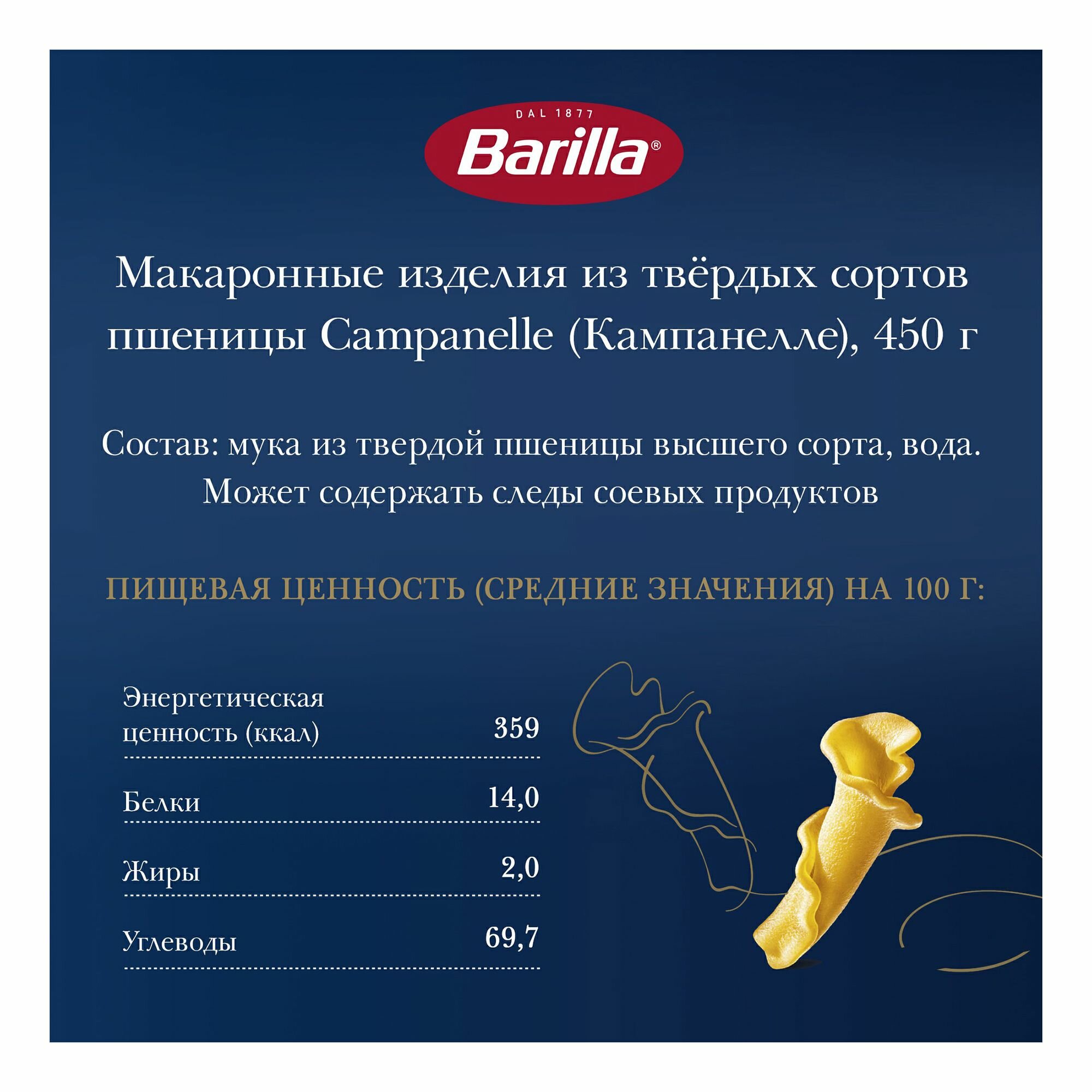С пастой Кампанелле Barilla вы с легкостью сможете превратить обычный день в особенный! В переводе с итальянского Кампанелле означает «колокольчики»: эта паста имеет волнистые края, похожие на цветочные лепестки, и полый центр для лучшего удержания соусов. Для производства макарон Barilla Campanelle используются только натуральные ингредиенты: очищенная питьевая вода и высококачественная мука из твёрдых сортов пшеницы. Кампанелле отлично сочетаются с густыми сливочными, мясными или овощными соусами. Экспериментируйте и создавайте невероятные блюда с изысканной пастой Кампанелле Barilla!