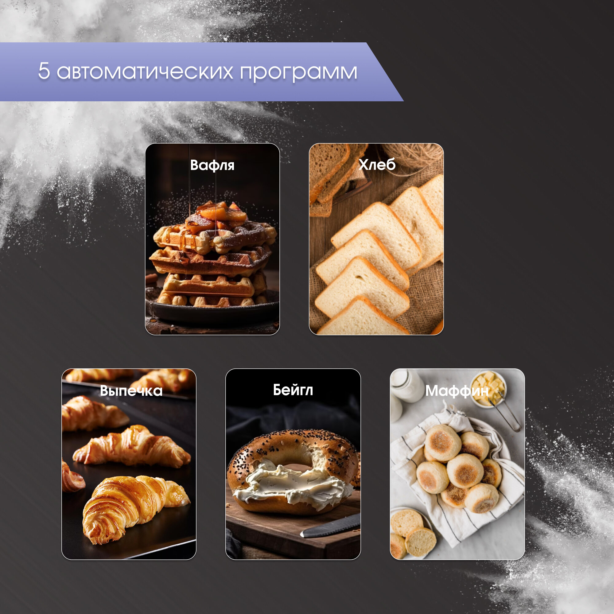 | Дополнительная информация | 5 программ для различных видов хлеба, 7 степеней поджаривания, LED дисплей, сенсорное управление |