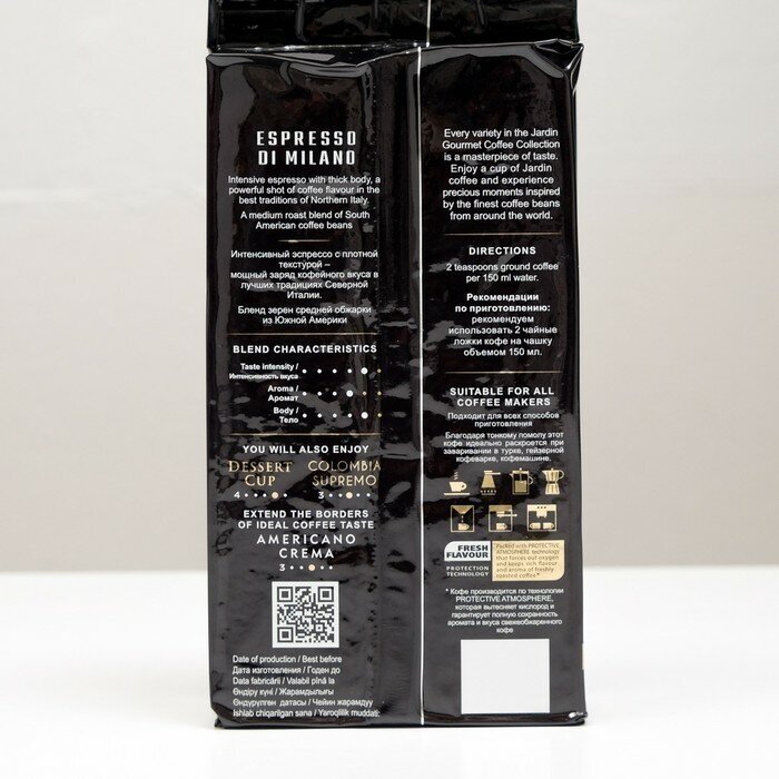 Бленд лучших сортов Арабики создан в северо-итальянской кофейной традиции и идеально подходит для приготовления чашечки настоящего эспрессо. Чашечка Jardin Espresso di Milano, открывающая богатый наполненный вкус с тончайшими миндальными нотами, станет идеальным завершением обеда, ланча или ужина. Кофе темной обжарки и тонкого помола.