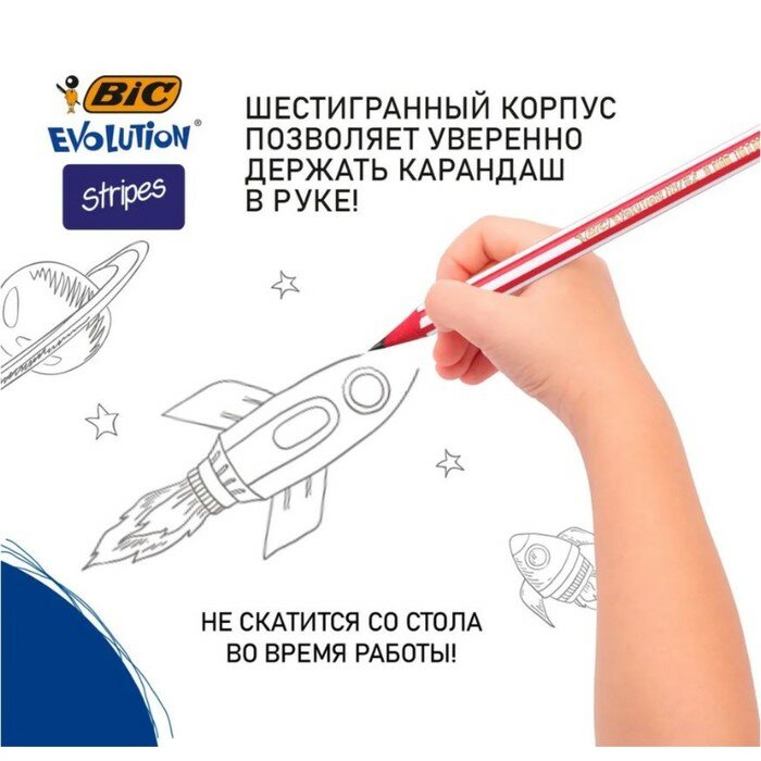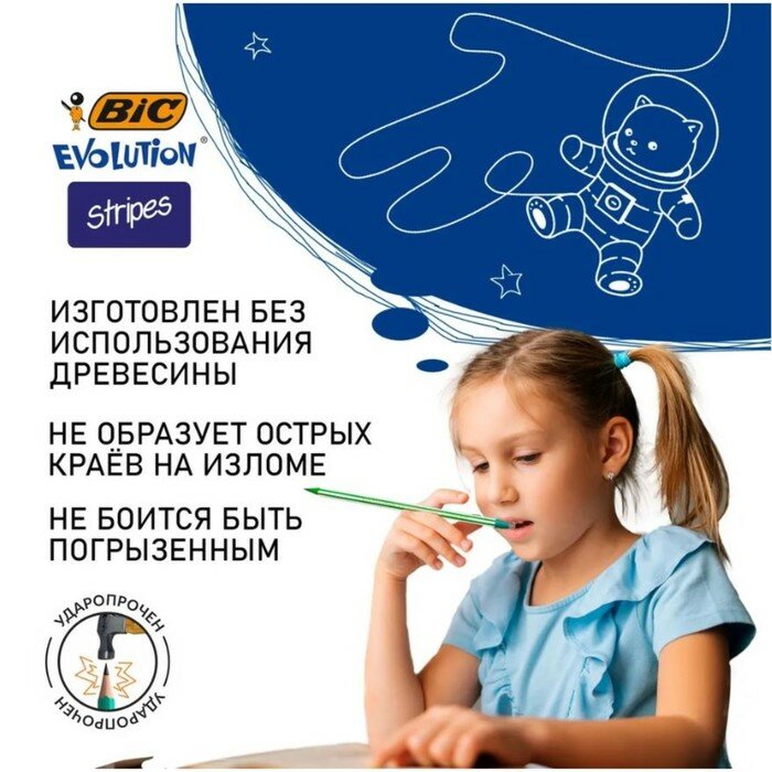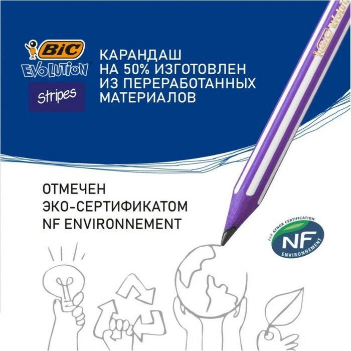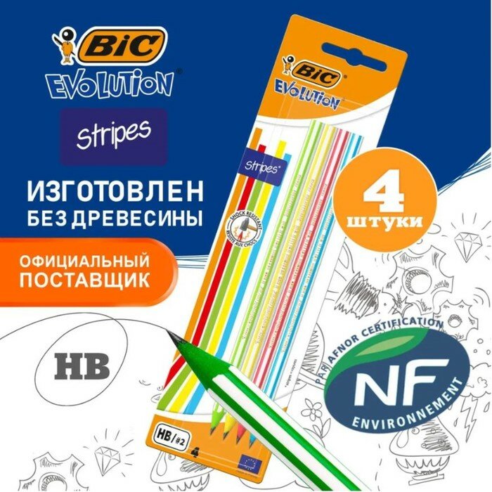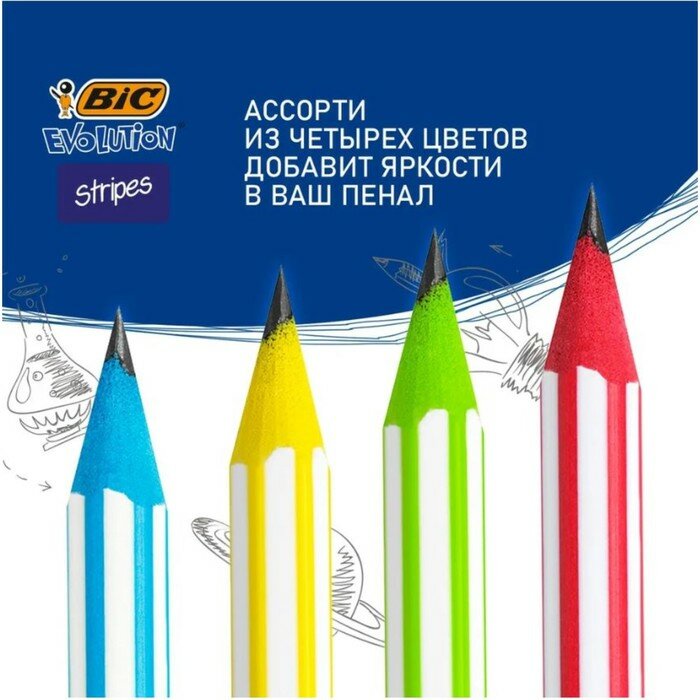 Модная полосатая версия легендарного чернографитового карандаша BIC Evolution. Представлена в четырёх ярких оттенках, чтобы вдохновлять на творчество и оживлять все эти скучные пеналы. Идеальные карандаши для рисования и письма, они отлично подходят детям любого возраста для работы дома или в школе. Твёрдо-мягкие HB карандаши BIC Evolution Stripes - это инструменты высочайшего качества с прочными грифелями, которые точатся в одно мгновение. Поскольку они изготовлены без использования древесины, не образуют острых краёв на изломе. Эти карандаши производятся на собственных заводах BIC в Европе, поэтому могут похвастаться всеми фирменными характеристиками, гарантированно удовлетворяющими запросы даже самых взыскательных покупателей, ожидающих бескомпромиссного качества. Уже более 65 лет BIC создаёт высококачественные письменные принадлежности на любой бюджет, которые продаются по всему миру. Такая миссия помогла этой когда-то маленькой французской компании завоевать доверие потребителей и стать одним из мировых лидеров в категории канцелярских товаров.
