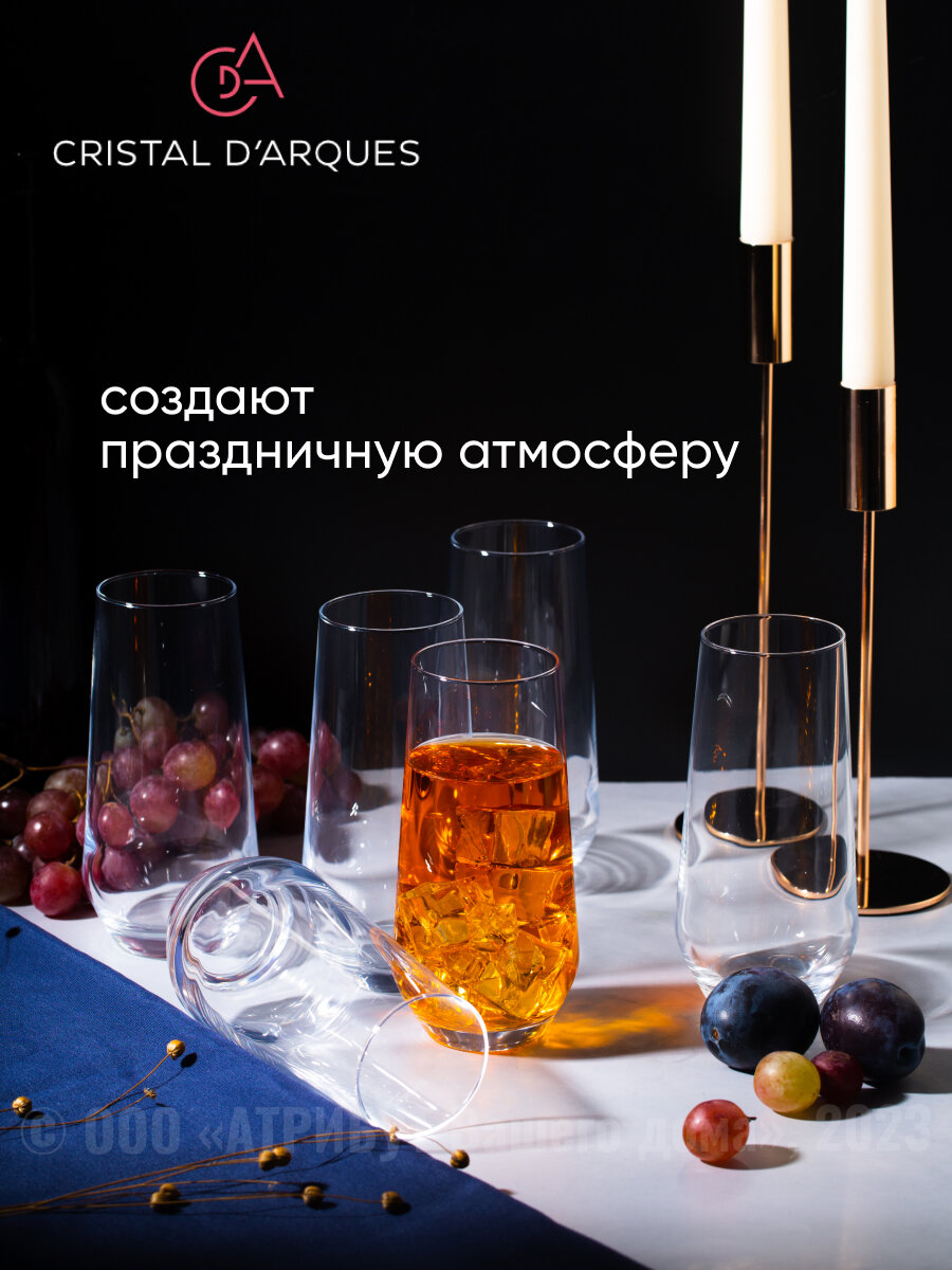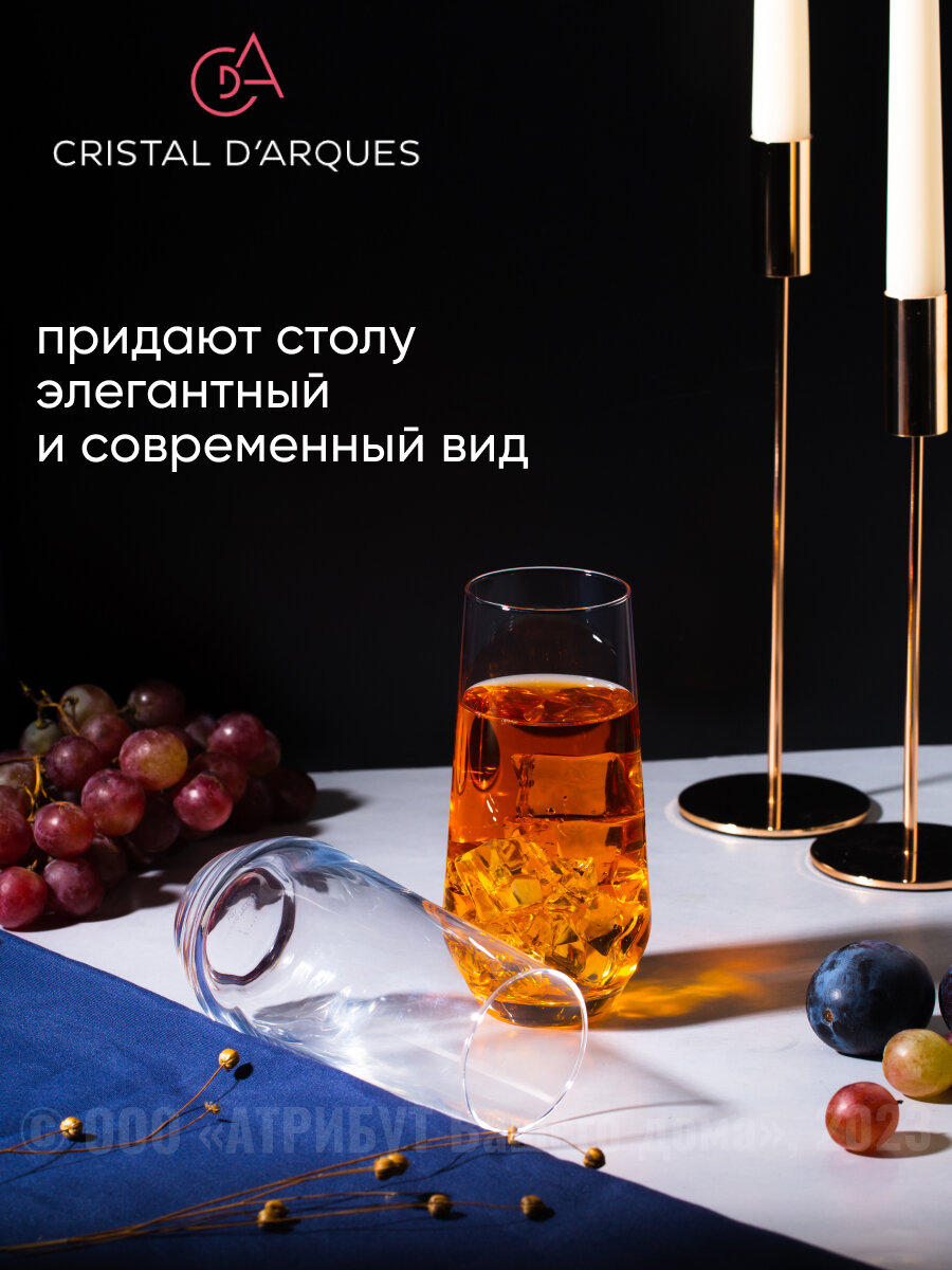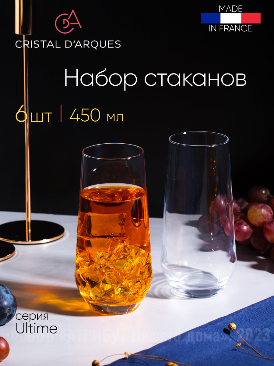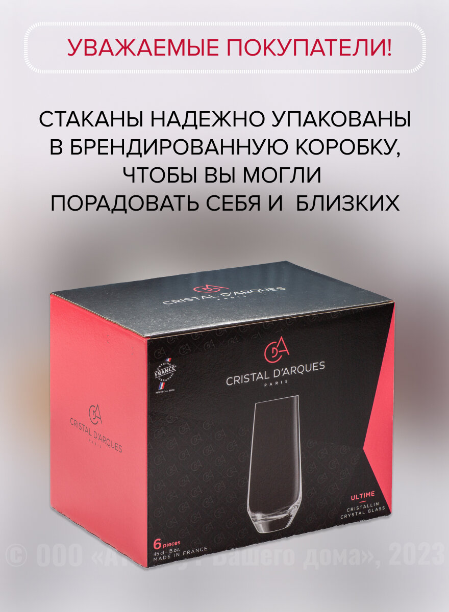 Бокалы и стаканы французского производителя разработаны для ценителей современного стиля, качества и элегантности во всем. Изготовлены из оригинального хрусталя Gristal Glass Cristalline. Стекло посуды имеет практически 100% прозрачность, что позволяет точно передать цвет и плотность напитка. Сохраняет первоначальный блеск в течении длительного времени, даже после длительного использования в посудомоечной машине. Бокалы и стаканы имеют яркий и чистый звук (звон). Посуда на 50% прочнее, чем заявлено в требованиях европейских стандартов, с учетом доработок значительно превосходит классический хрустально по прочности. Коллекции Cristal d Arques -это культовый дизайн вне времени.100% произведено во Франции.