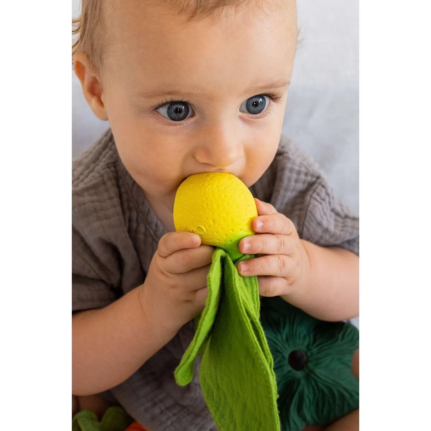 MINI DOUDOU-TEETHER JOHN LEMON - это прорезыватель для зубов из натурального каучука, дополненный фигурным платочком из органического хлопка для комфорта малышей во время обильного слюноотделения.
