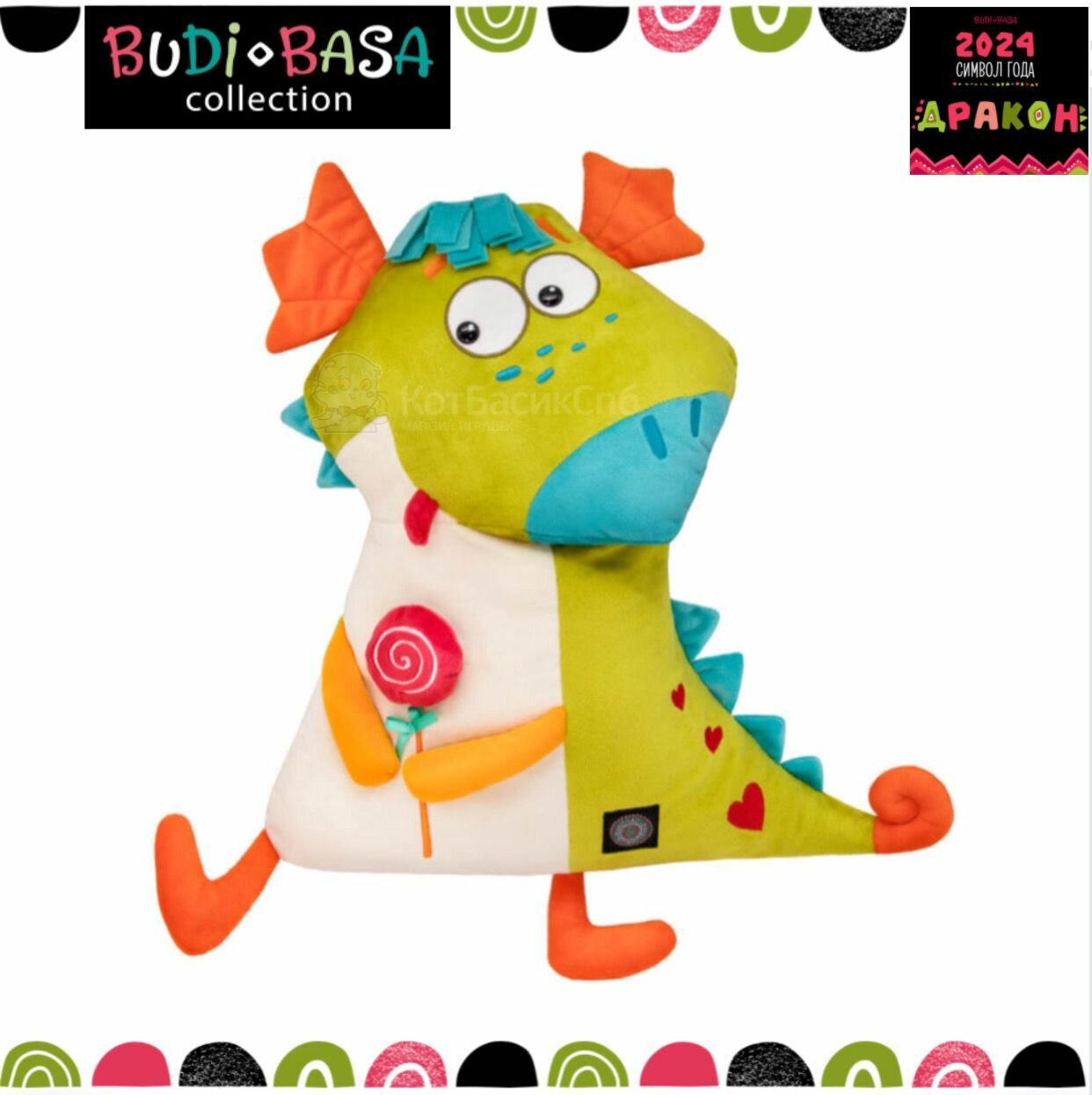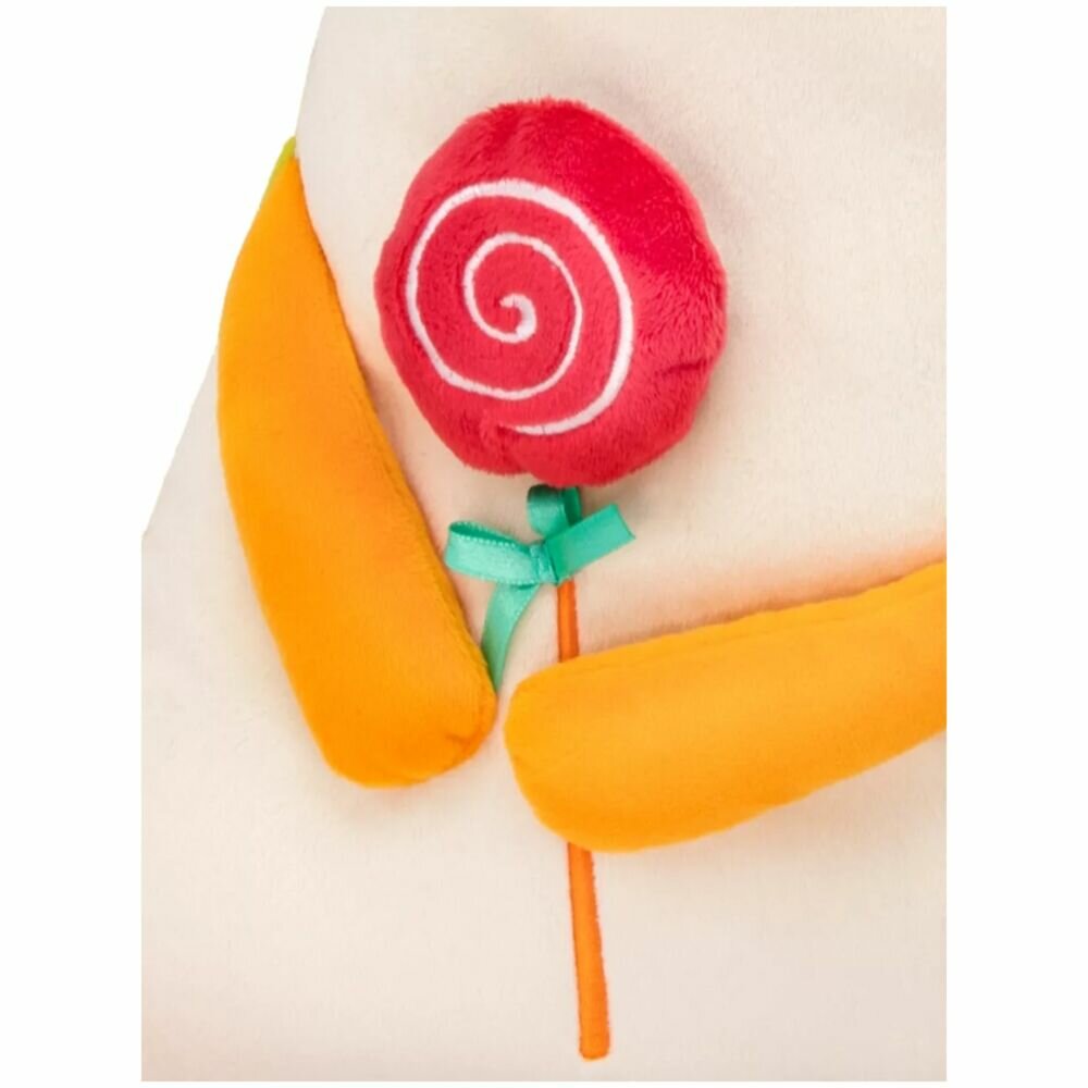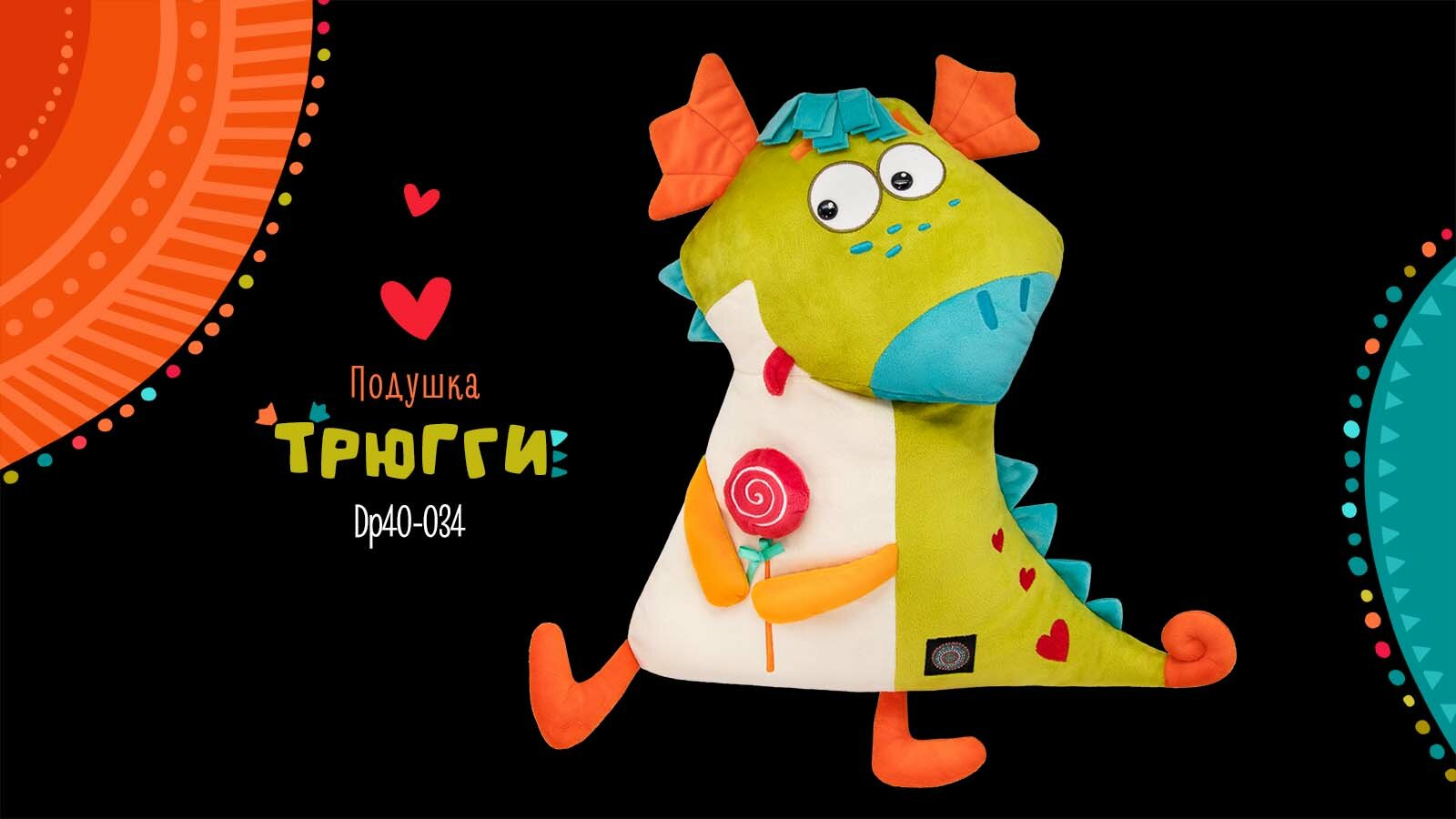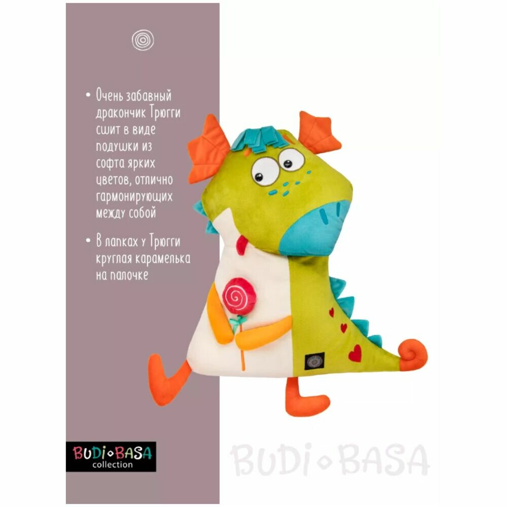 Очень забавный дракончик Трюгги сшит в виде подушки из софта ярких цветов, отлично гармонирующих между собой. В лапках у Трюгги круглая карамелька на палочке.