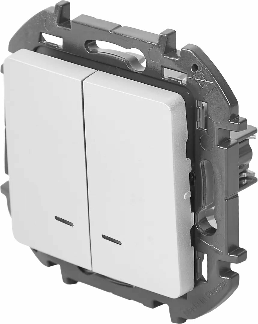 Предназначен для установки в электрических сетях жилых и общественных зданий и используется для управления приборами освещения, вентиляции и т.д. Используется для независимой коммутации двух нагрузок с одного места. Оснащен двумя светодиодными лампами для подсветки или индикации.