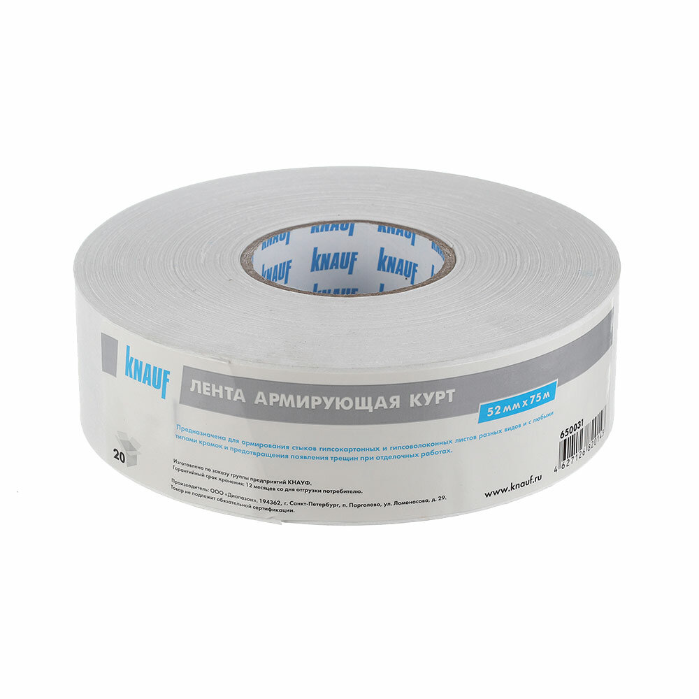 **Лента армирующая Knauf** усиливает стыки гипсоволокнистых и гипсокартонных листов. Совместима с любыми видами кромок. Препятствует образованию трещин на стенах. По центру имеется линия сгиба, которая упрощает монтаж при заделке угловых соединений.