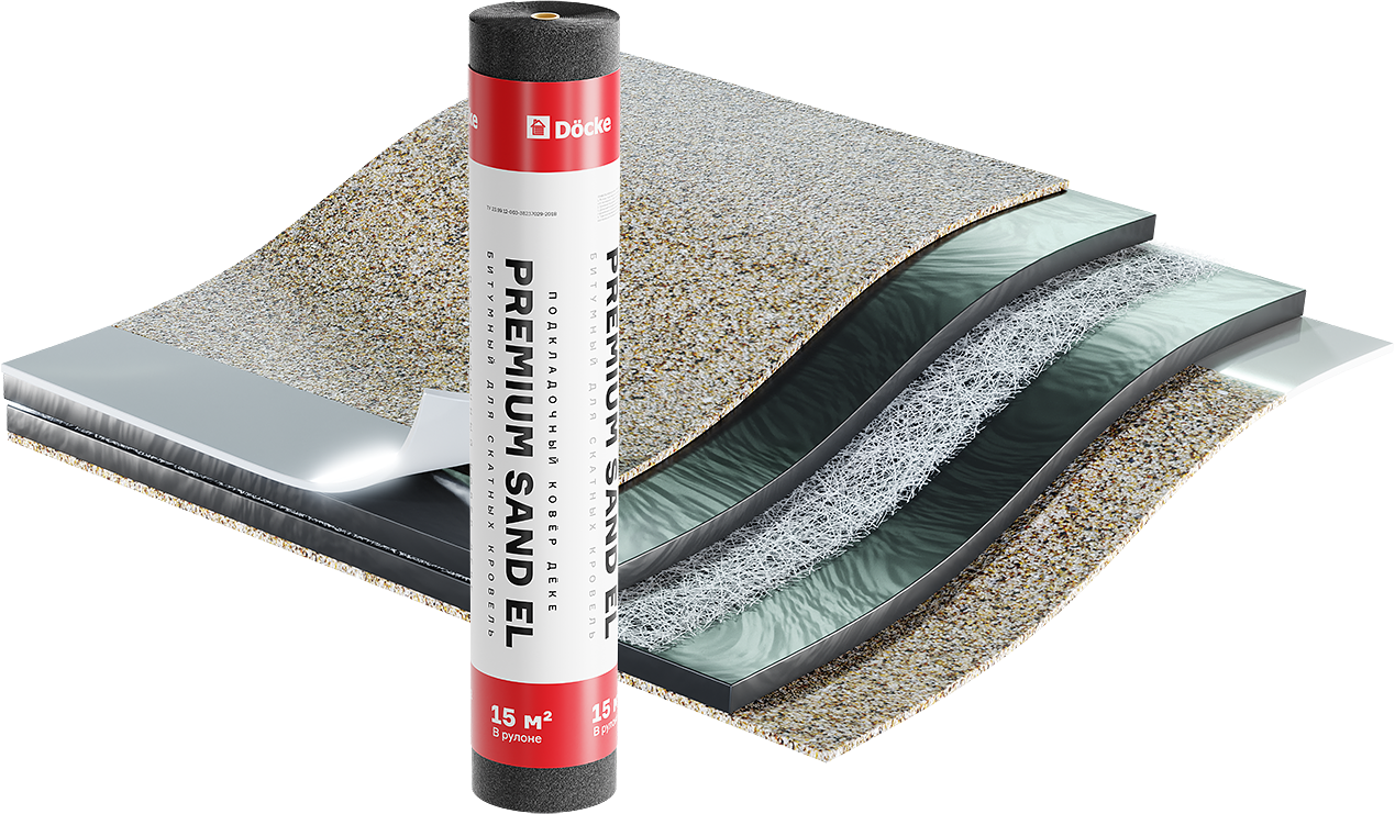 **Подкладочный ковер Döcke Premium Sand El** используется для дополнительной защиты кровли от проникновения воды, тем самым позволяет увеличить срок эксплуатации крыши. Этот материал усиливает и герметизирует изгибы на кровле, стыки, места примыкания верхнего элемента покрытия здания к стенам и трубам. Поставляется в рулоне.
