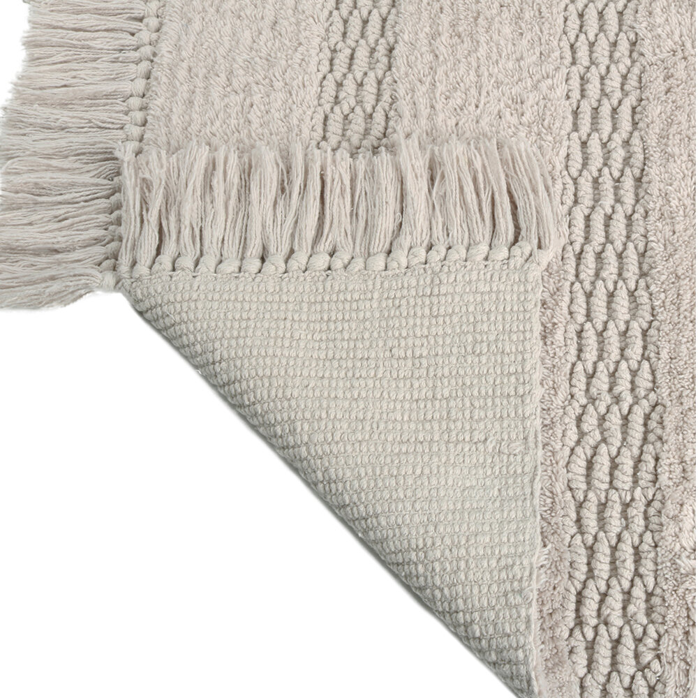**Коврик для ванной Fixsen Sandal** бежевого цвета изготовлен из натурального хлопка и декорирован бахромой по краям. Мягкий ворс высотой 10 мм хорошо впитывает влагу, быстро сохнет, препятствует размножению грибка и бактерий. Производитель рекомендует ручную стирку.
