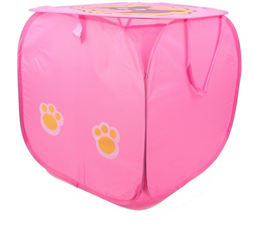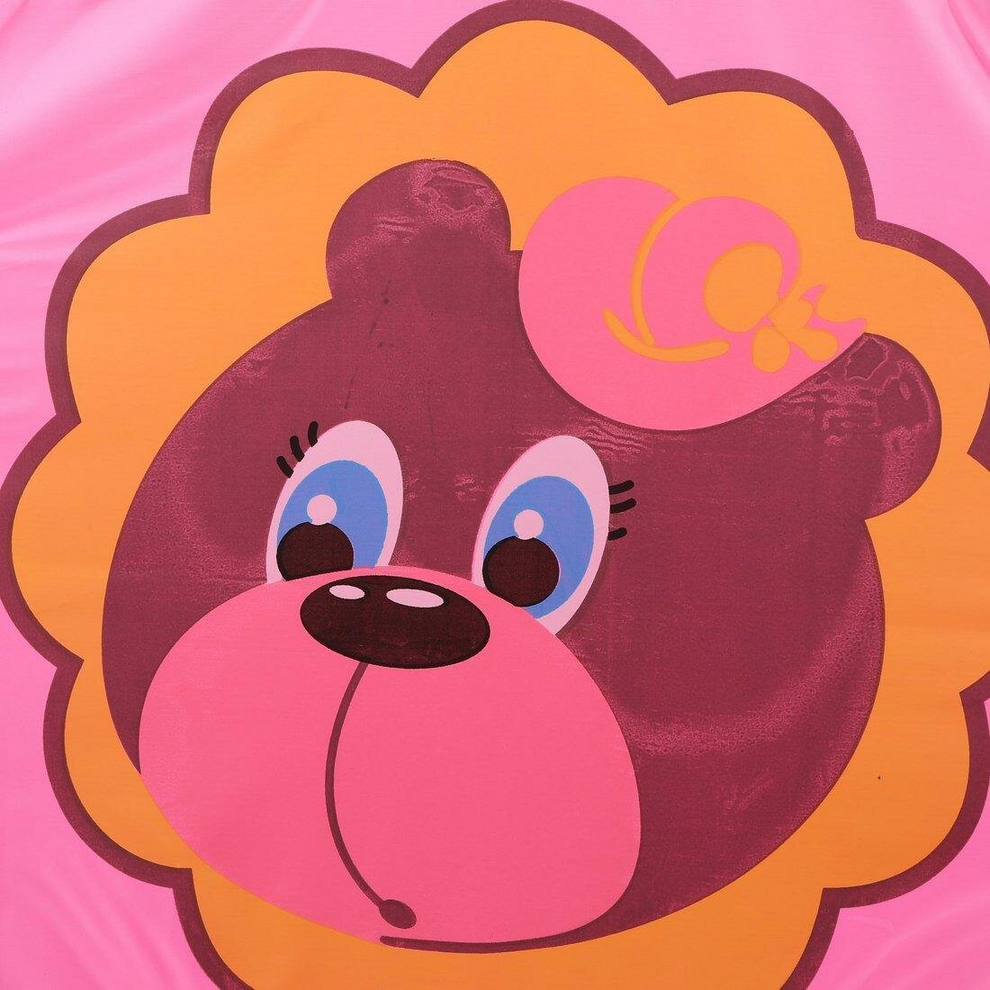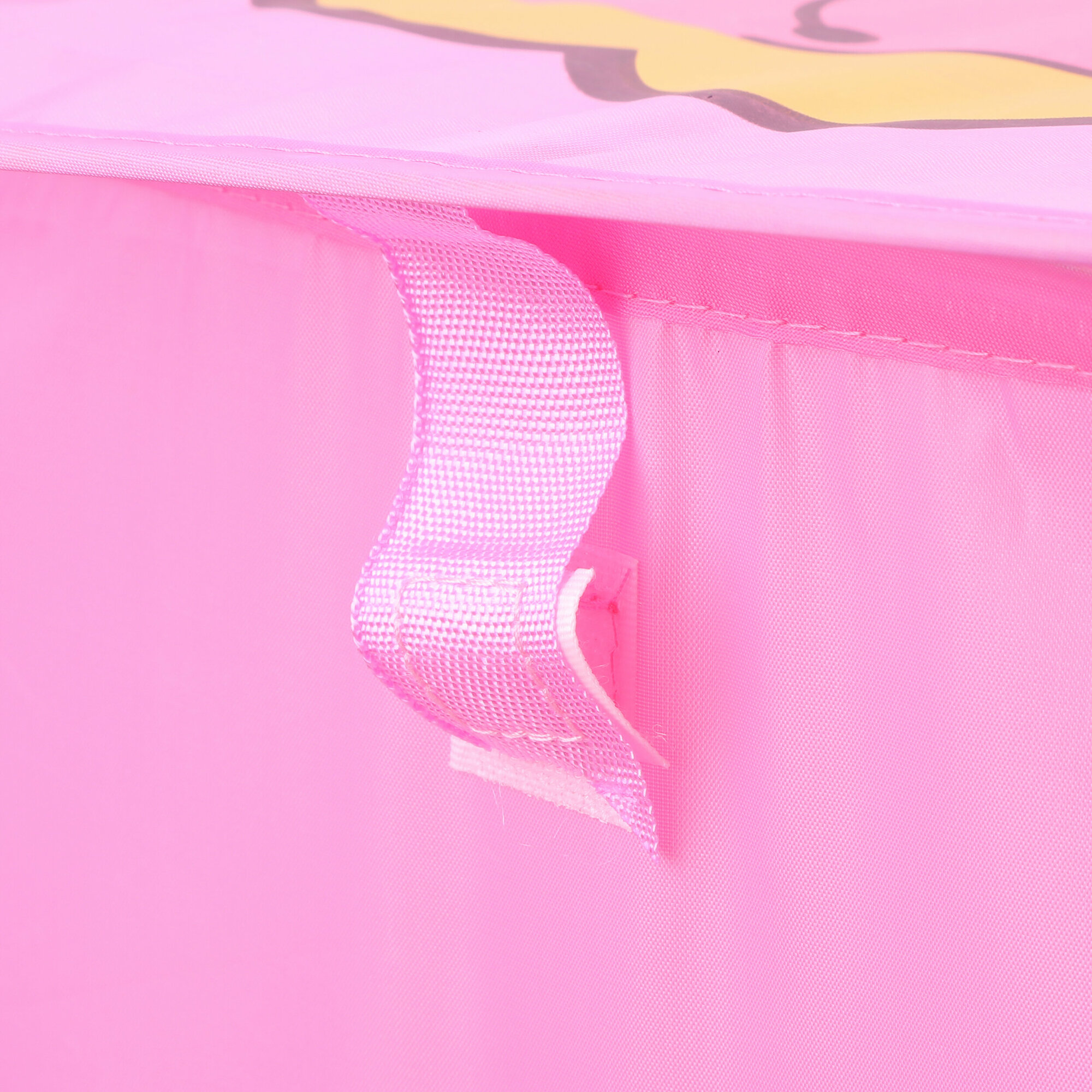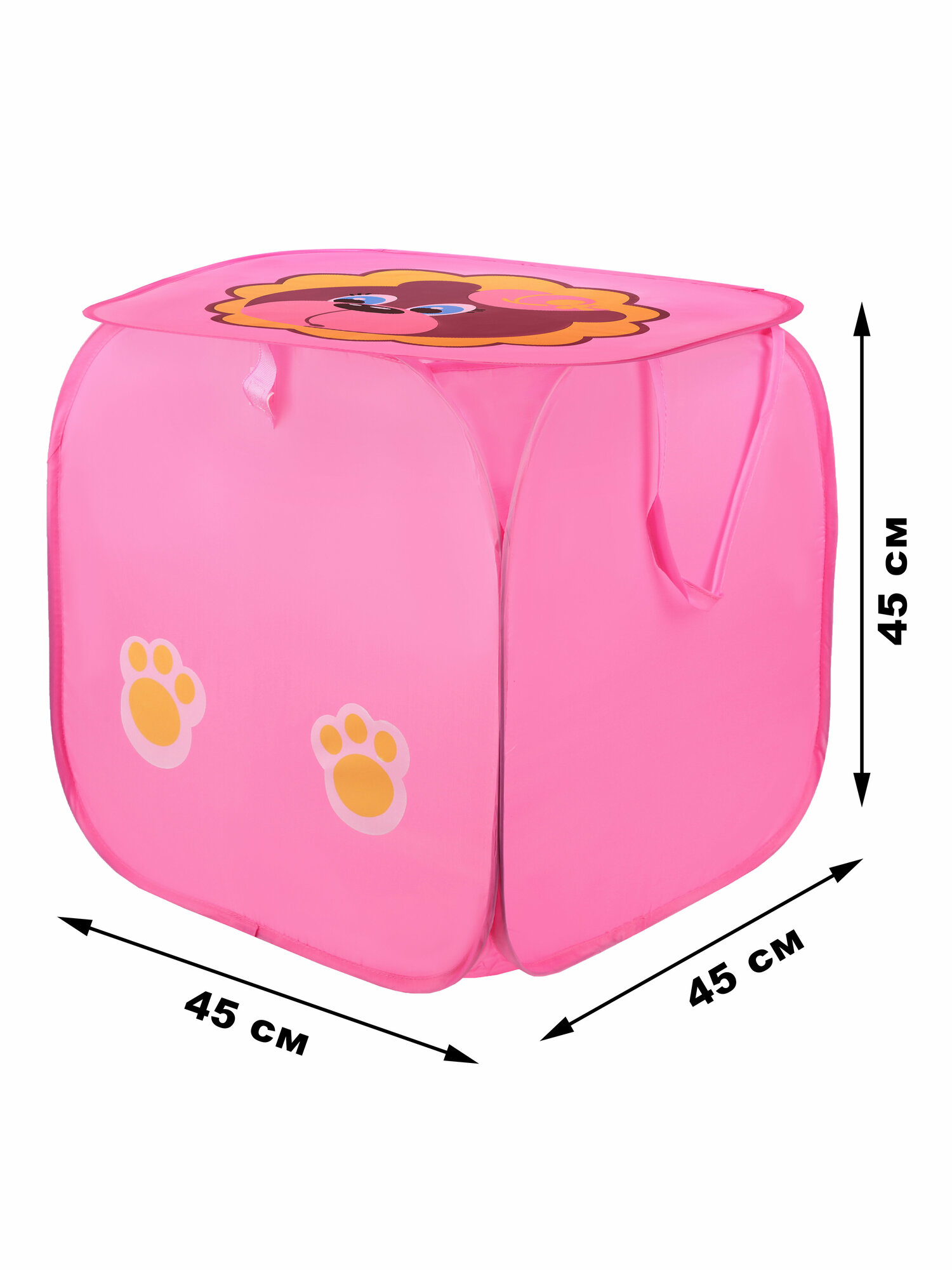 Она предназначена для компактного хранения игрушек или вещей ребёнка. В сложенном виде корзина не занимает много места, удобно складывается и легко раскладывается. Изделие выполнено в приятной розовой цветовой гамме с изображением прелестного медвежонка. По бокам есть 2 текстильные ручки для переноски. Крышка закрывается на липучку.