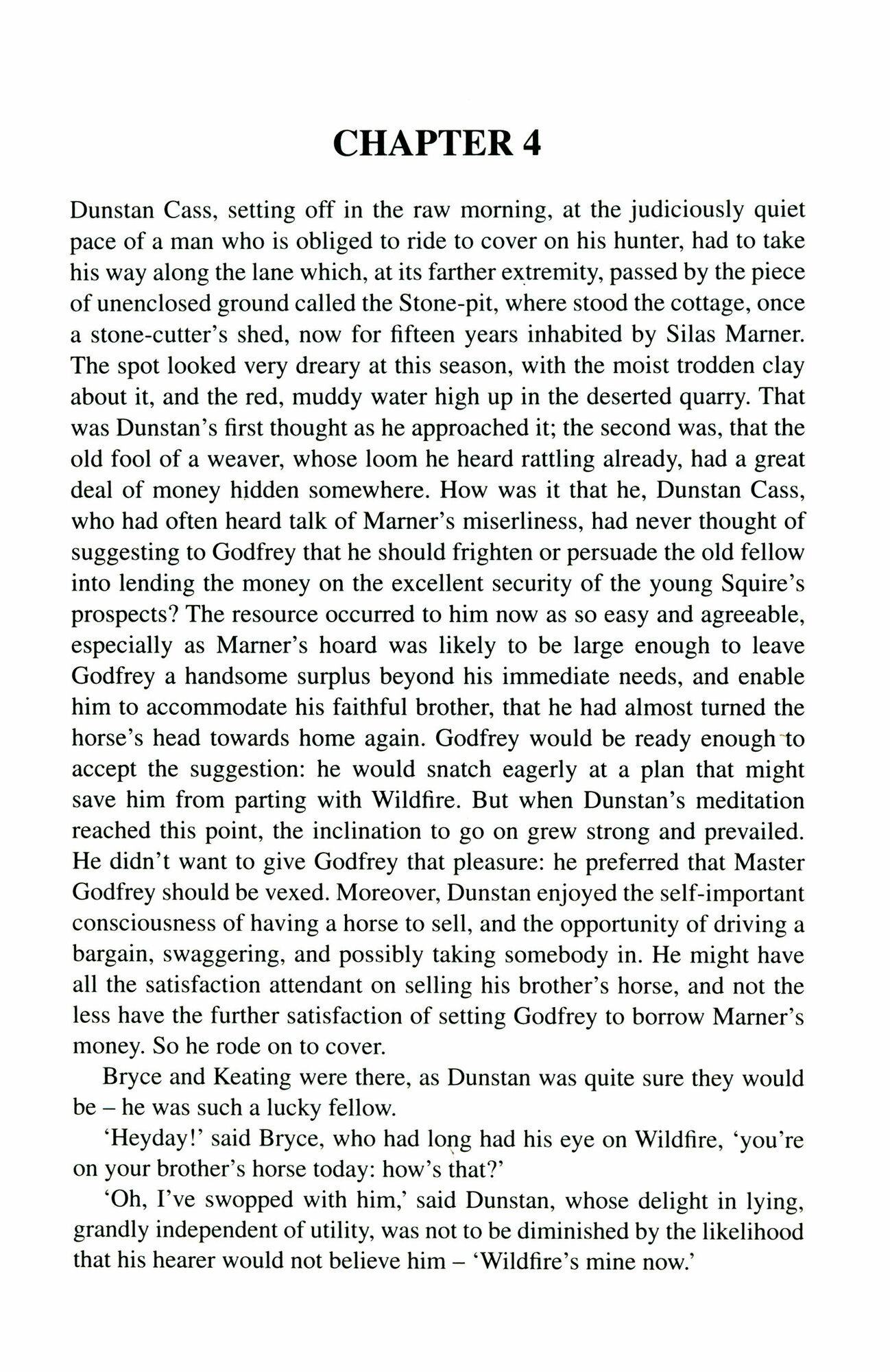 Silas Marner (1861) is Eliot's classic tale of an outsider. A weaver who comes to live and work alone in the Midlands village of Raveloe, Silas Marner's sole pleasure is to count his growing hoard of gold. When it is stolen, his life ceases to have meaning - until Eppie wanders into the weaver's cottage one snowy New Year's Eve and falls asleep on his hearth. Eppie is two years old.
