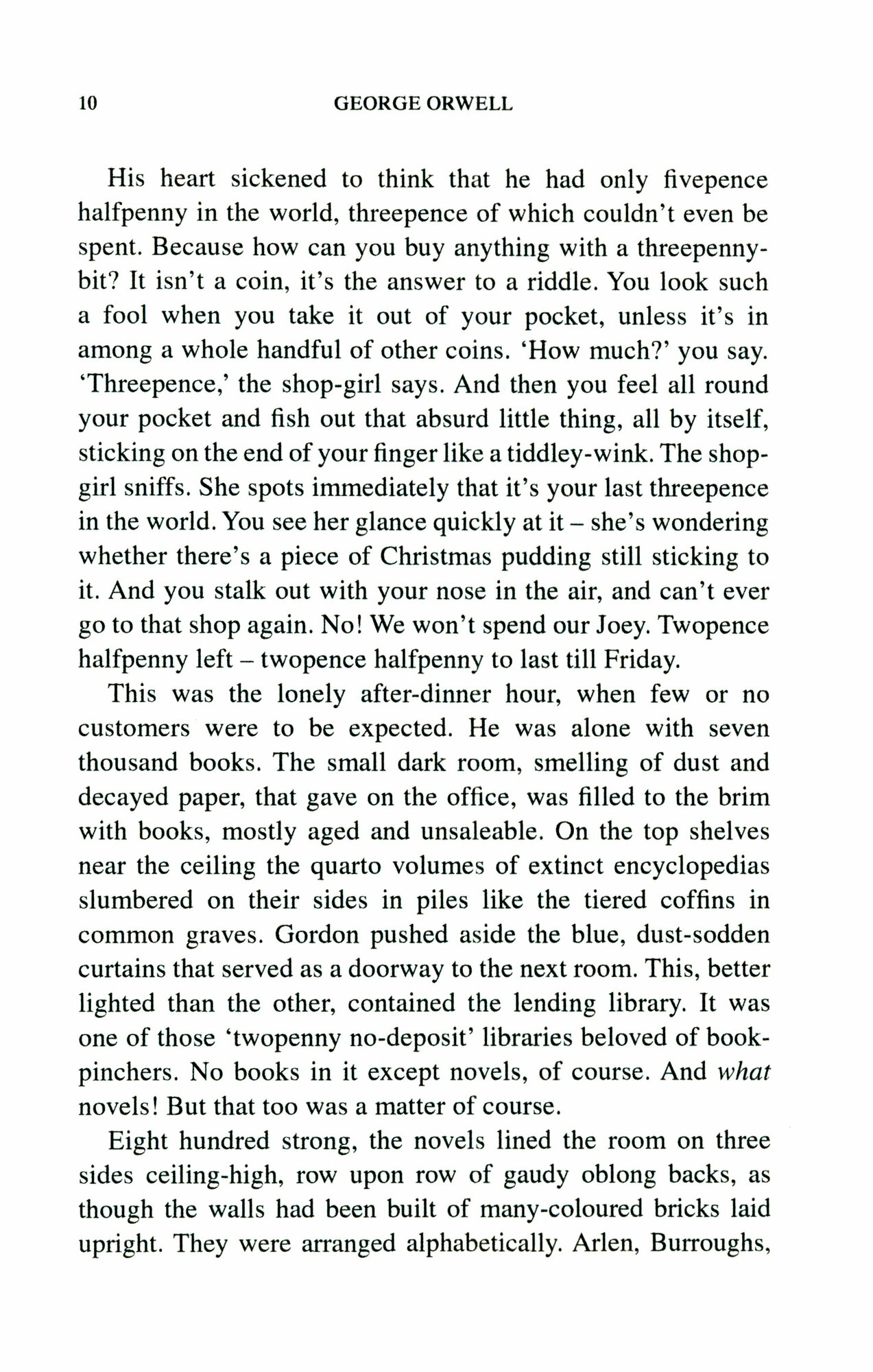 Gordon Comstock is a man in thrall to his principles. He believes that money lies at the heart of all society's evils, so he decides to trade in his well-paid job at an advertising agency for the humble wages of a bookshop assistant.