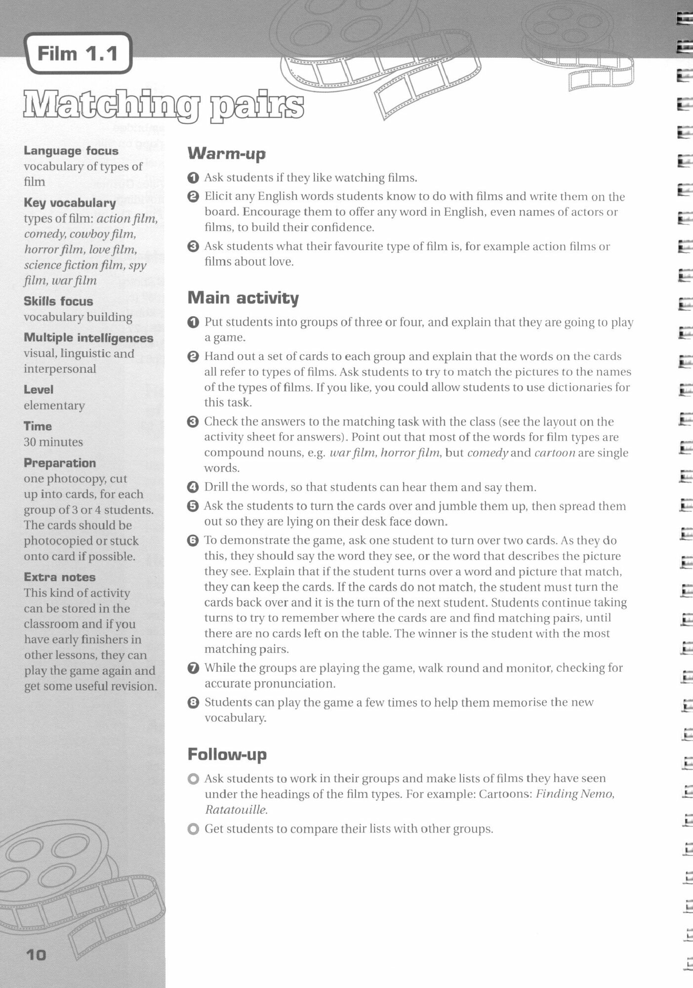 Containing over 40 activities specifically designed for teenagers, this is an ideal photocopiable resource for busy teachers. The activities cover three popular themes – Film, TV and Music – and they provide graded supplementary material for three different levels, elementary, intermediate and upper-intermediate, all in one book. Based on the theory of multiple intelligences, there is a variety of tasks including role-plays, quizzes, board games and debates which practise all four skills in a fun way. Each activity is supported by step-by-step teacher's notes and extension ideas ready to photocopy and go!