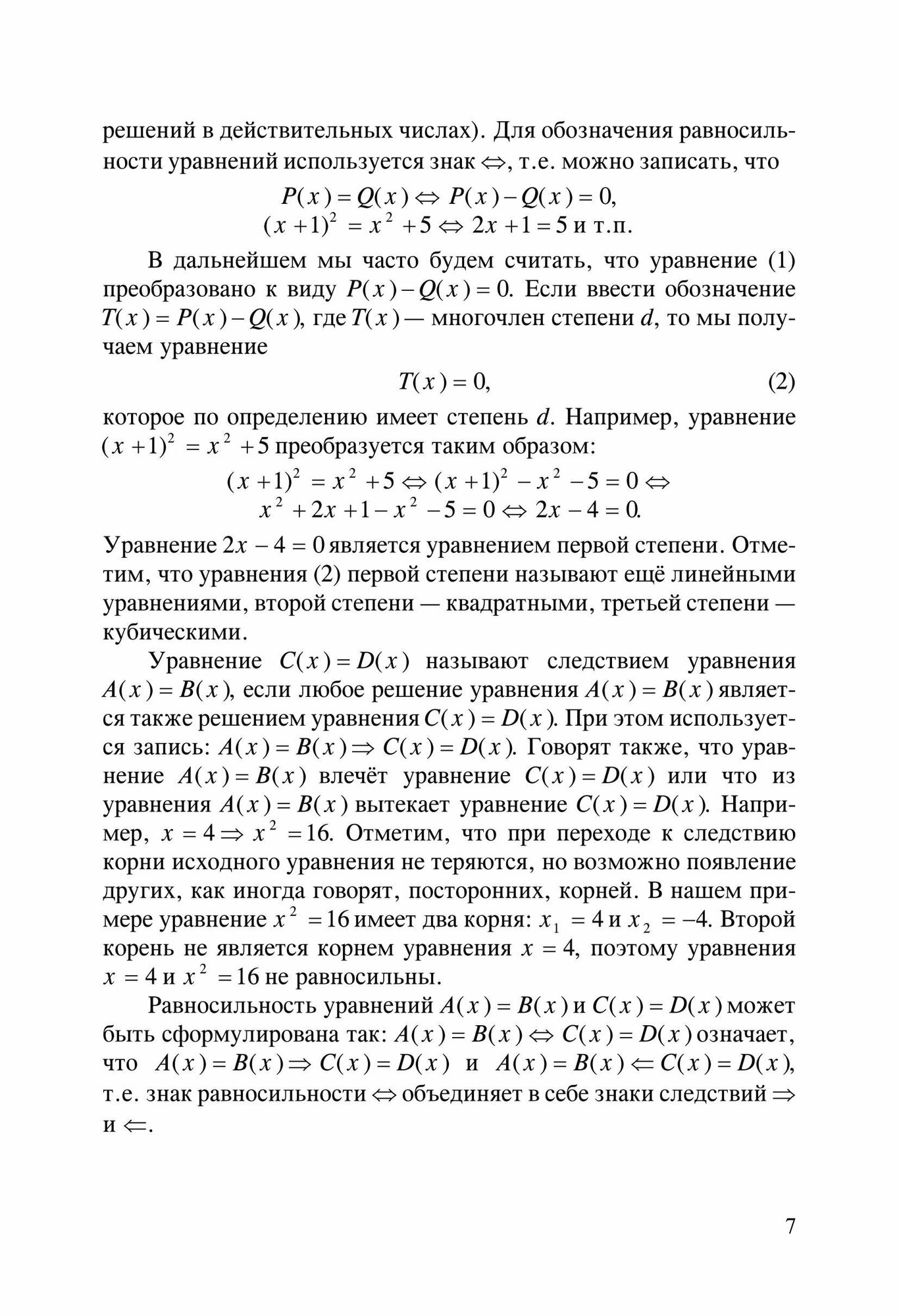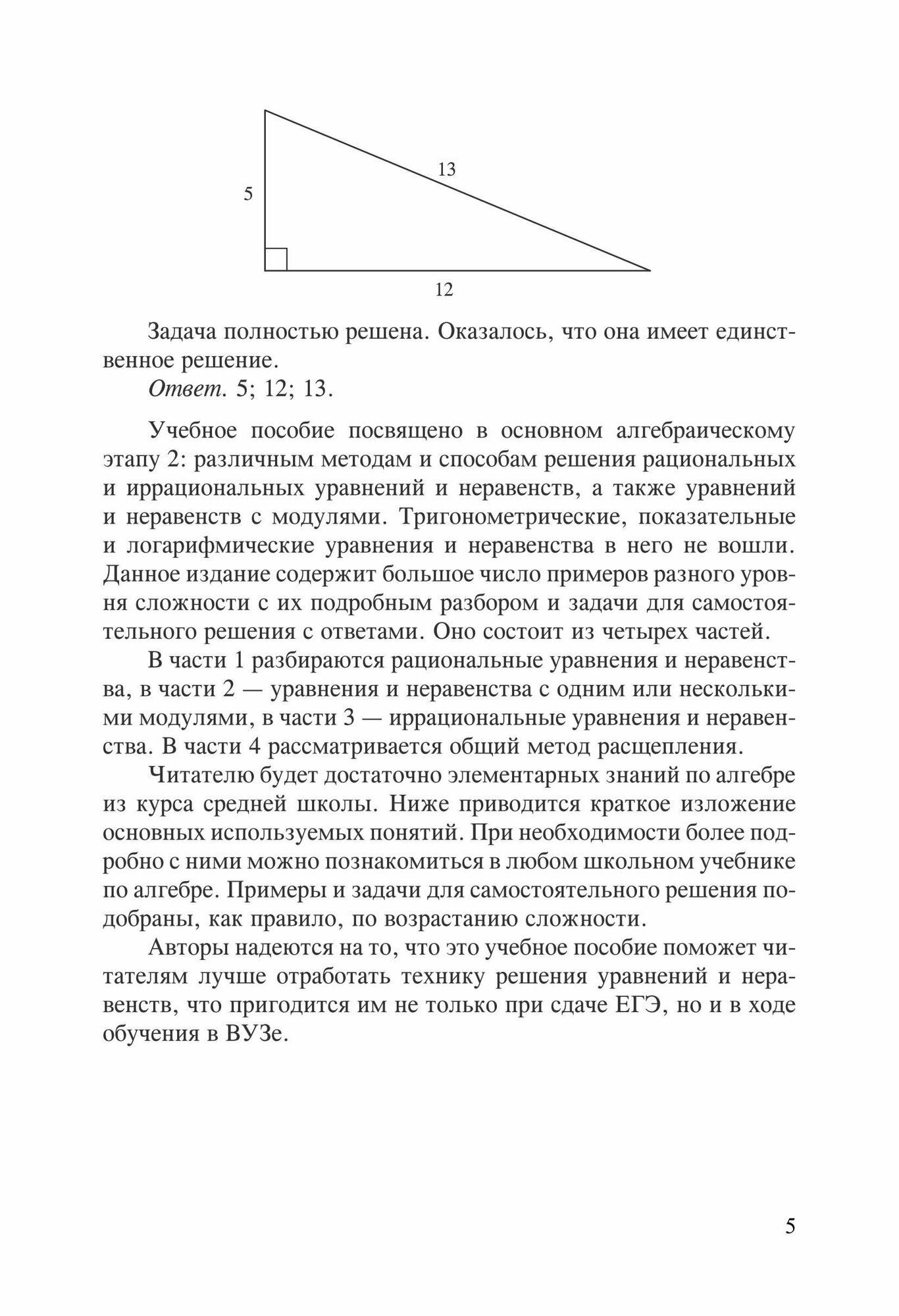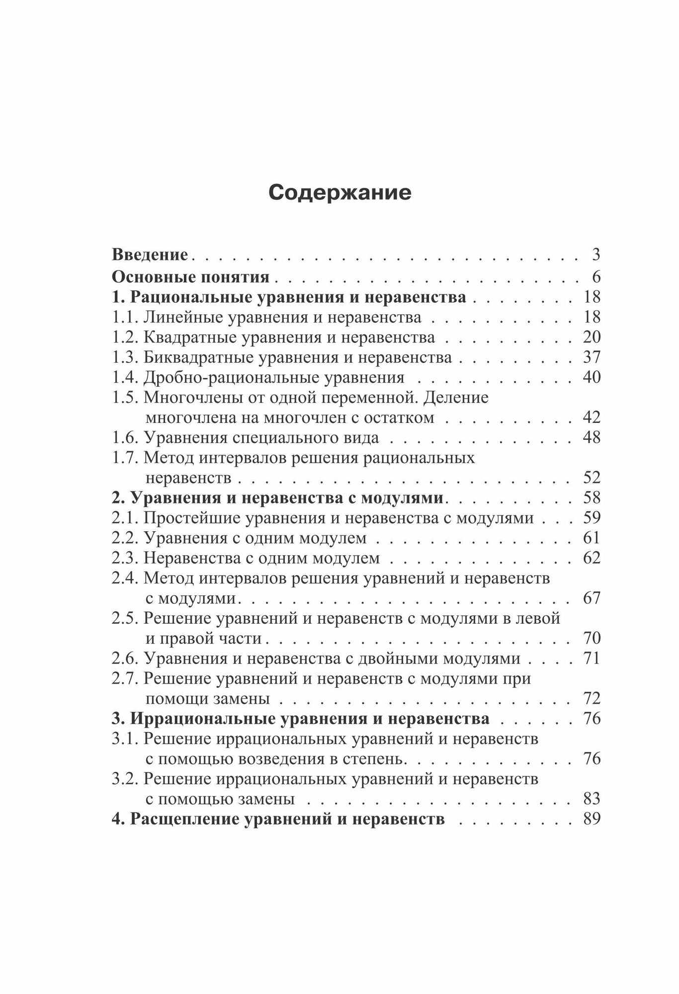 В учебном пособии представлены основные методы и приёмы решения алгебраических и иррациональных уравнений и неравенств, а также уравнений и неравенств с модулями. Примеры подобраны из вариантов вступительных экзаменов, ЕГЭ, математических олимпиад и приводятся в порядке возрастания сложности. Также предложены задачи для самостоятельного решения с ответами. Примеры и задачи, приводимые в этой книге, в течение ряда лет тестировались и использовались авторами на подготовительном отделении МГУ имени М.В. Ломоносова для повышения математического уровня школьников старших классов.