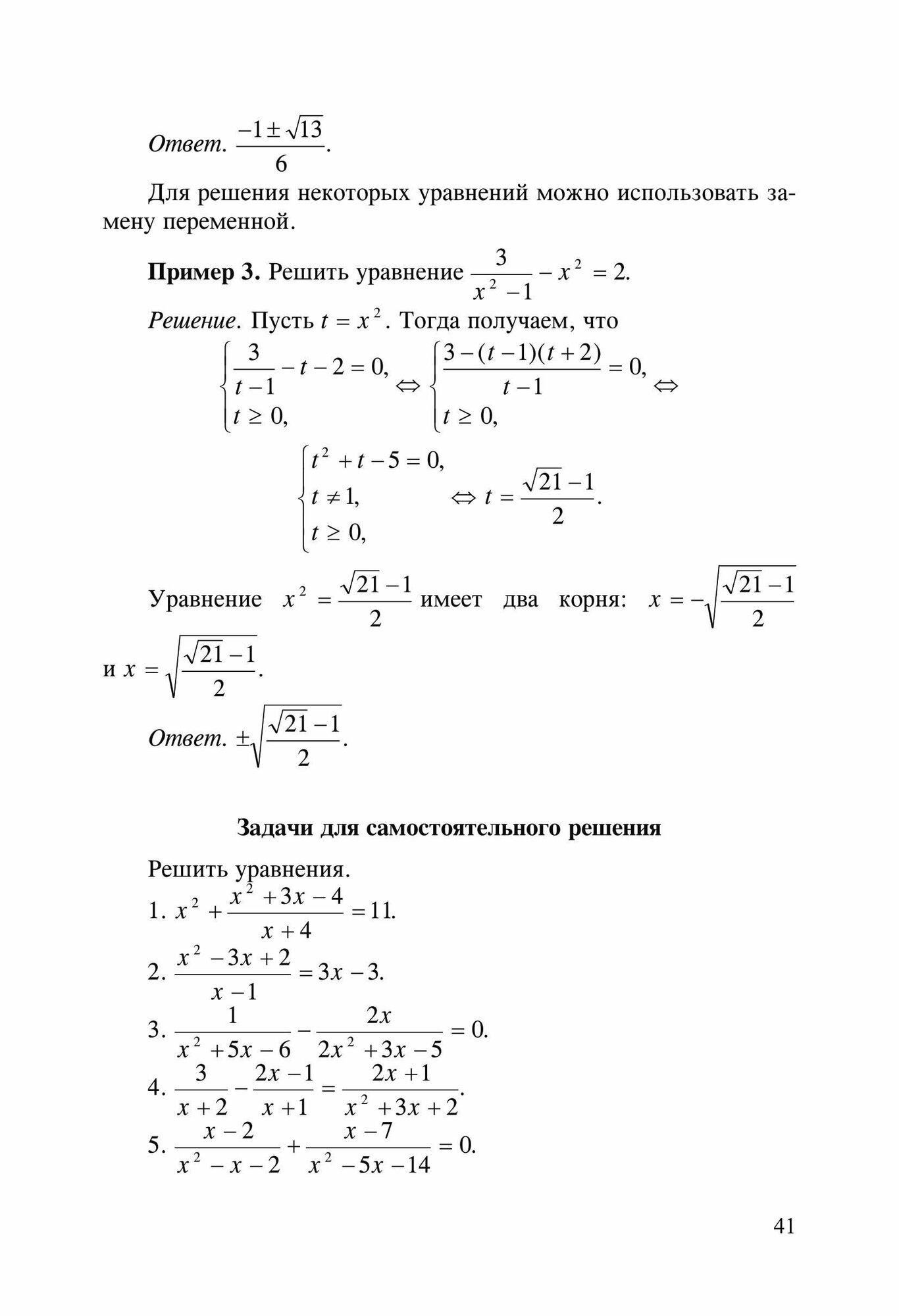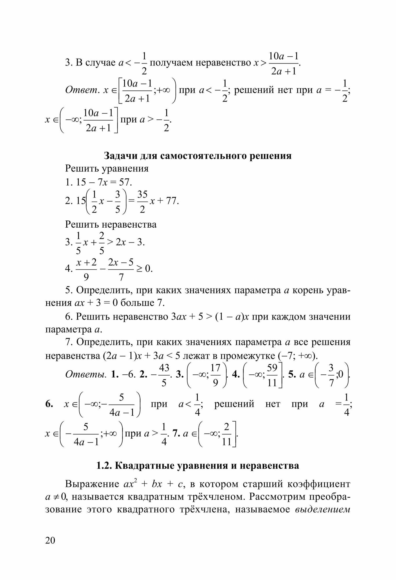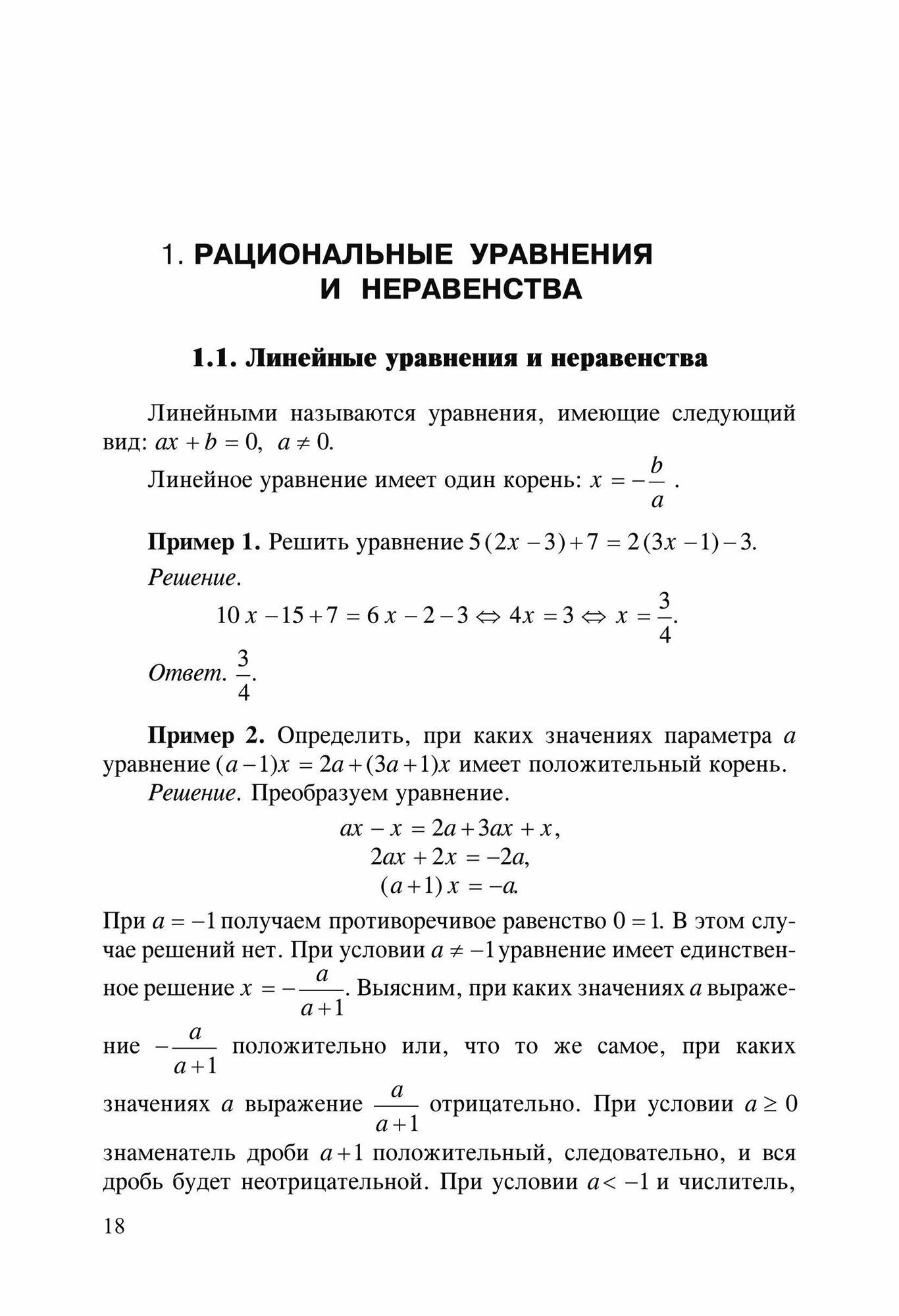 В учебном пособии представлены основные методы и приёмы решения алгебраических и иррациональных уравнений и неравенств, а также уравнений и неравенств с модулями. Примеры подобраны из вариантов вступительных экзаменов, ЕГЭ, математических олимпиад и приводятся в порядке возрастания сложности. Также предложены задачи для самостоятельного решения с ответами. Примеры и задачи, приводимые в этой книге, в течение ряда лет тестировались и использовались авторами на подготовительном отделении МГУ имени М.В. Ломоносова для повышения математического уровня школьников старших классов.