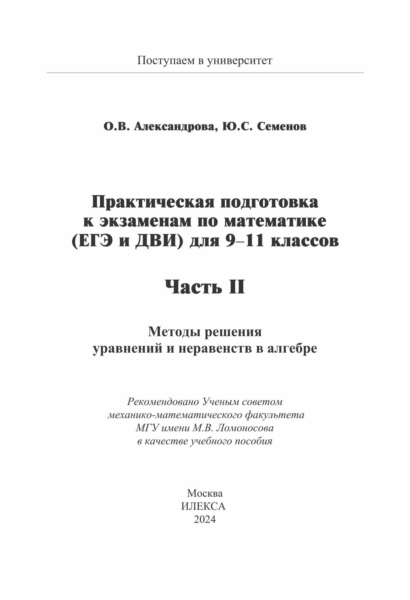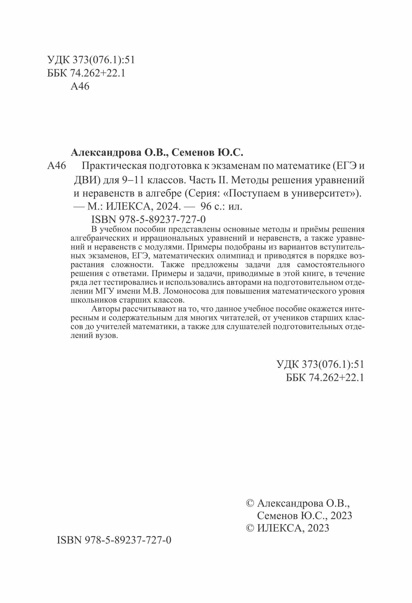 Математика. 9-11 классы. Практическая подготовка к экзаменам. Часть 2. Методы решения уравнений (Александрова Ольга Владимировна, Семенов Юрий Станиславович); Илекса, 2024