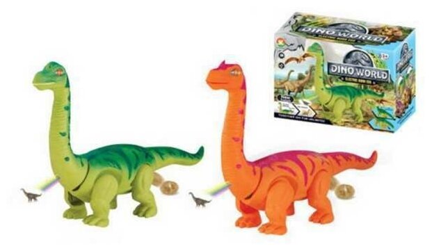 Этот динозавр умеет ходить вперед, при этом откладывая яйца. При движение издает звуки имитирующие рев настоящего динозавра. Его глаза горят, их цвет меняется. Из встроенного на груди динозавра проектора идет свечение с голограммой динозавра.