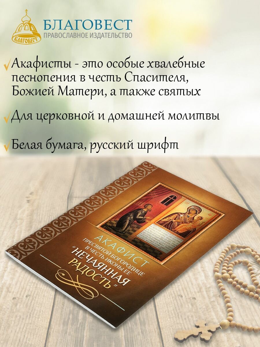 В данной брошюре содержится акафист, читаемый перед иконой Пресвятой Богородице «Нечаянная Радость». К иконе «Нечаянная Радость» православные христиане традиционно обращаются в тяжёлых жизненных ситуациях. В современной орфографии, с ударениями.