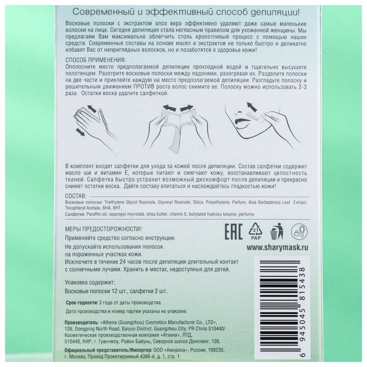Полоски восковые для лица алоэ Shary/Шери Athena Cosmetics Manufacturer (1252669)